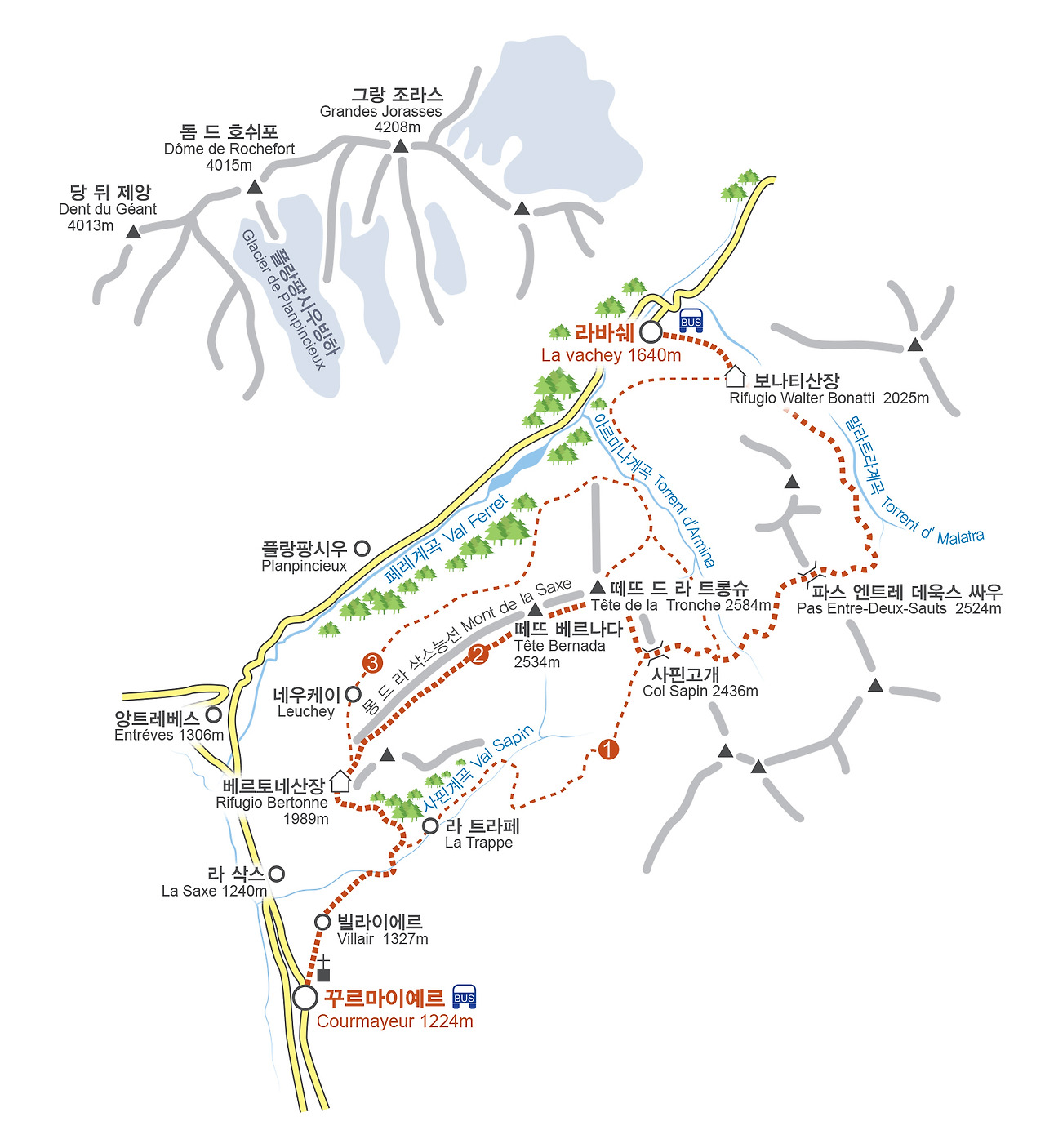 이 구간의 종착지인 보나티산장(Rifugio Walter Bonatti, 2025m)이나 라바쉐 마을로 가는 길은 세 가지다.