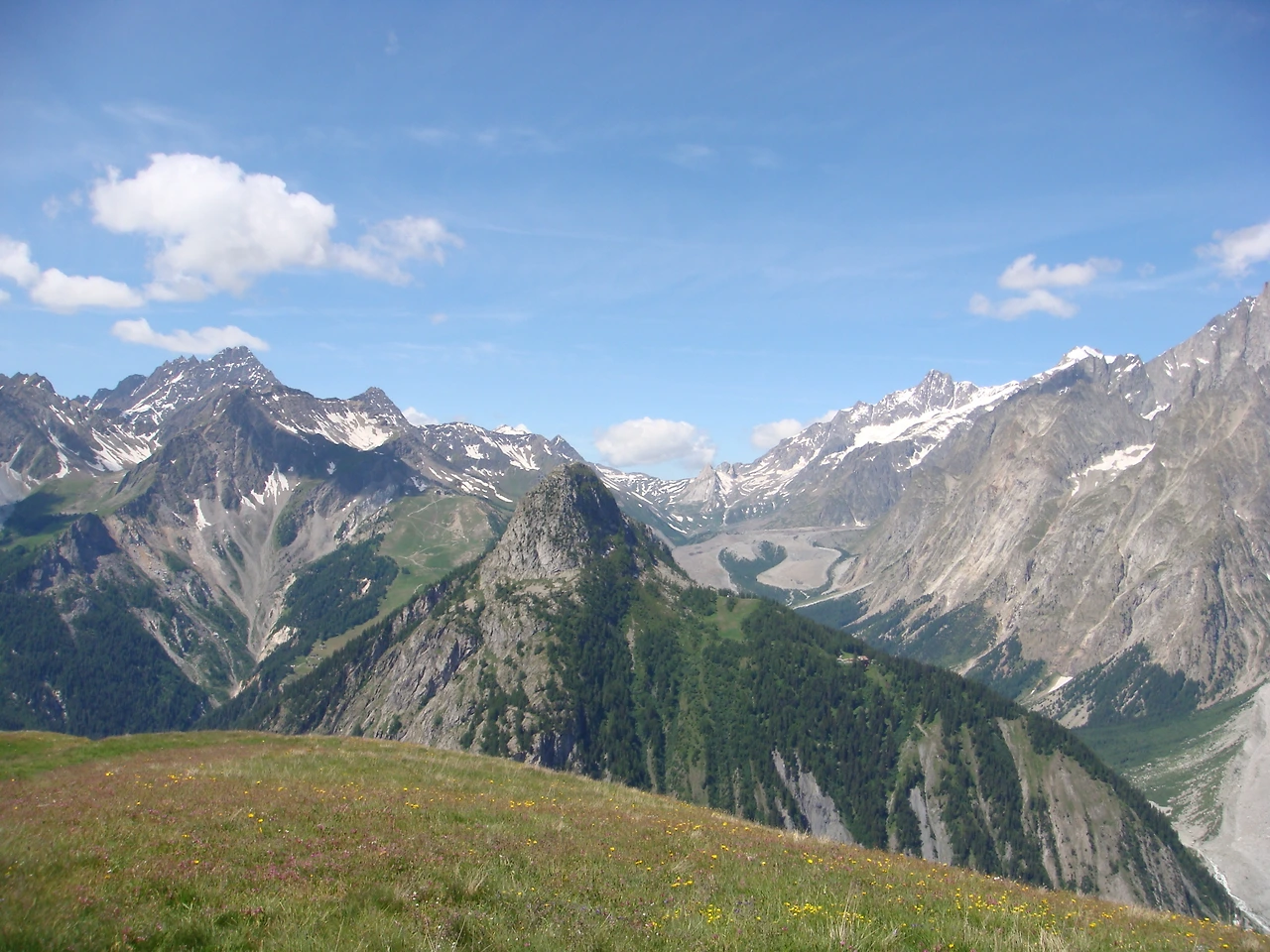 이 때쯤이면 꾸르마이예르 시내를 압도하던 몽쉐티프(Mont chetif, 2343m)가 눈높이가 되고 삼림지대도 벗어나게 된다. 여기서 바로 오른쪽으로 꺾어지면 베르토네 산장이 보이는 지점이다. 몽블랑의 남쪽 면이 먼저 장관을 드러내고 이내 멀리 베르토네산장(Rifugio Bertonne, 1889m-1970년대 이탈리아의 대표적인 산악인으로 1977년 몽블랑 뒤 따귈(Mont-Blanc du Tacul, 4248m)근처에서 비행기사고로 죽은 조르지오 베르토네(Giorgio Bertone)를 기념하기 위해 1982년 건축한 산장)이 보인다.