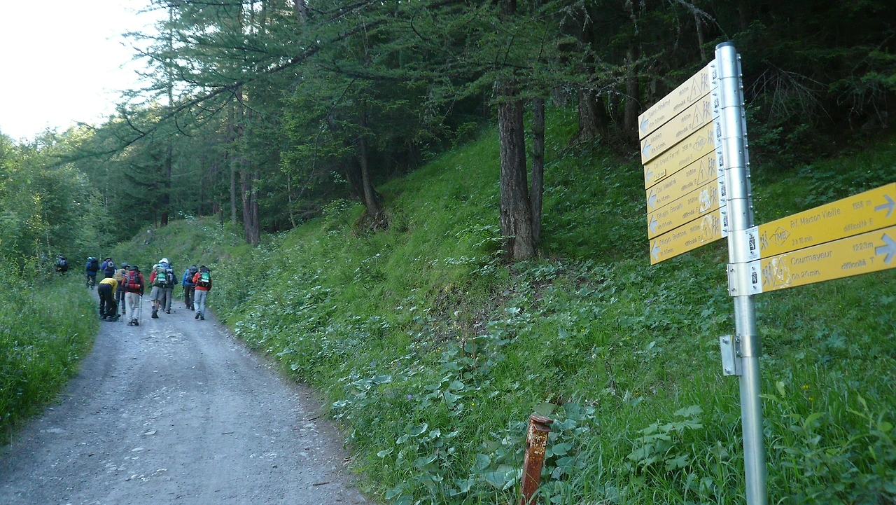보통은 베르토네 산장 쪽인 ②코스를 선호한다. 그 유명한 몽 드 라 삭스 (Mont de la saxe)능선을 걸어 보고 싶기 때문일 것이다. 빌라이에르(Villair) 갈림길에서 왼쪽으로 길을 잡는다. 이때부터는 급경사의 오르막이 시작된다. 길 오른편의 큰 돌에 TMB42번 루트로 가는 길이라는 노란색 사인을 따라 아름다운 숲 속 길을 1시간 쯤 오르게 된다.