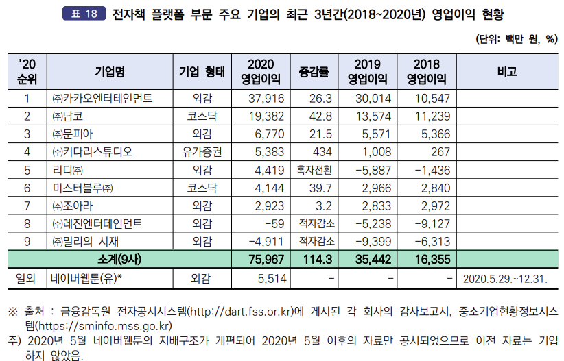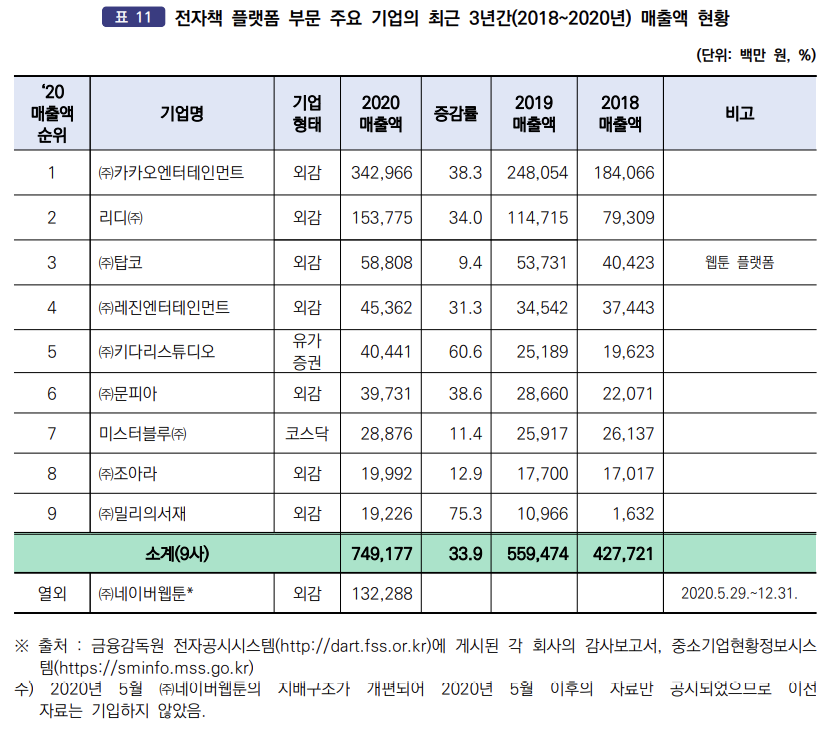 한국출판산업진흥원에서 발간한 '2020 출판산업통계'에 따르면 주요 전자책 플랫폼 9곳의 총 매출액은 7천 492억 원으로 전년 대비 33.9%가 성장했다. 영업이익은 760억 원으로 114.3%나 성장했다. 전자책을 찾는 비율이 조금씩 늘고 있으며, 그에 따라 전자책을 제공하는 플랫폼들의 매출과 영업 이익 모두 성장 중임을 알 수 있다.