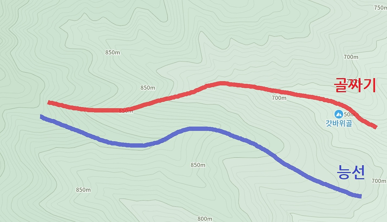산은 능선길이 다니기도 편하고 전파도 잘 잡힙니다. 등고선으로 보았을 때 산의 정상에서 바깥쪽으로 볼록한 곡선이 능선이고 오목한 쪽이 골짜기죠. 옛날 사람들도 능선이 다니기 편했을 테니 왕래가 더 많았겠죠. 따라서 능선 쪽이 유물도 더 잘 나옵니다. 또한 등고선 간격이 좁으면 얼핏 지름길 같아 보여도 급경사이므로 그쪽으로 진행하지 않는 게 안전합니다. 만약 골짜기 같은데로 접어들어 휴대전화 신호가 약해질 경우 다시 능선 쪽으로 이동하면 신호가 세집니다.