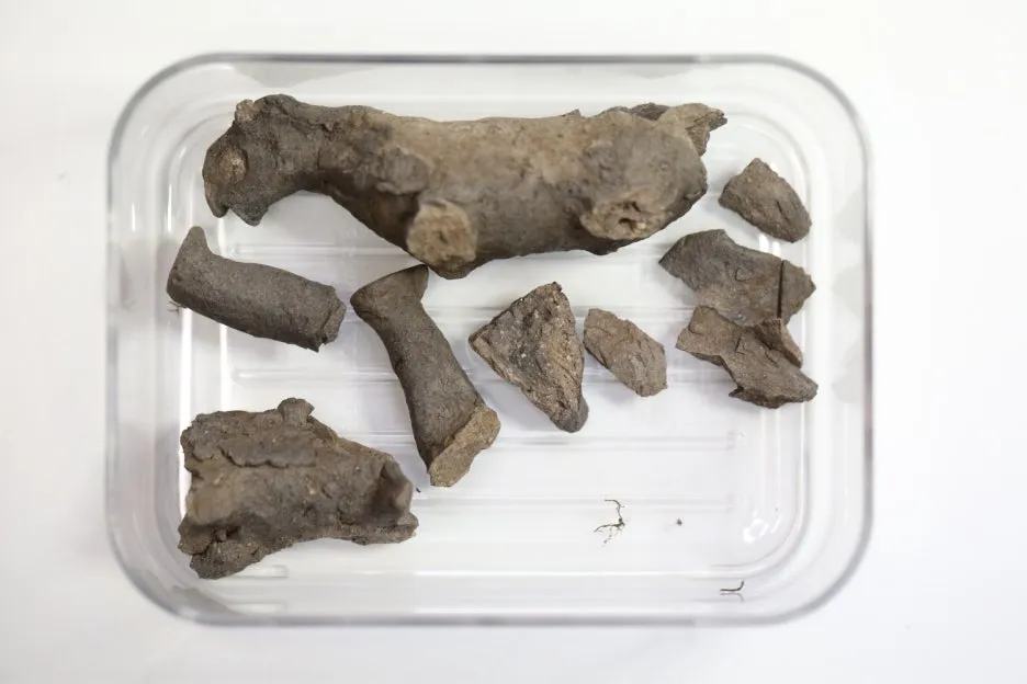 이번엔 철마와 비슷한 '마형 토우(馬形 土偶)'가 나왔습니다. 작은 말을 흙으로 빚은 다음 구워 만든 것으로, 금속탐지기엔 걸리지 않으나 곡괭이로 땅을 파다 보면 간혹 생체 레이더에 잡히곤 합니다. 그런데 몸이 아주 조각조각 났네요. 마치 토막살마의 현장을 보는 듯합니다.