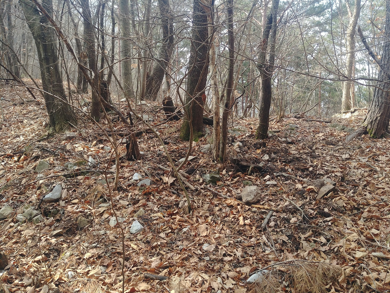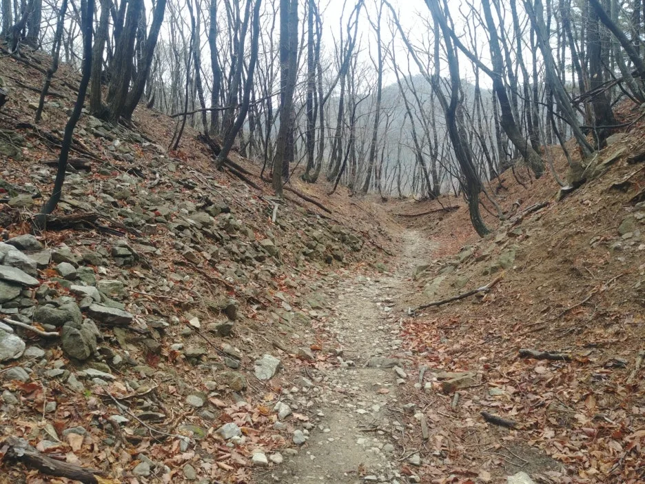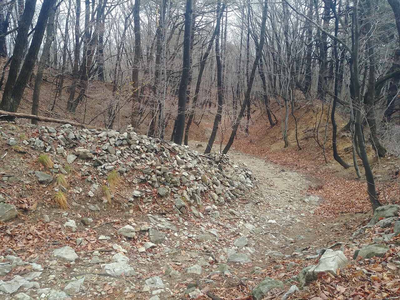 이곳은 비가 적게 와서 그런지, 배수가 잘돼서 그런지는 몰라도 길이 질척거리지 않아 좋았습니다. 좌우에 많은 돌무더기들이 있지만 이건 비교적 근래에 길을 정비하면서 쌓인 것이라 엽전이 나오는 그 돌무더기는 아닙니다.