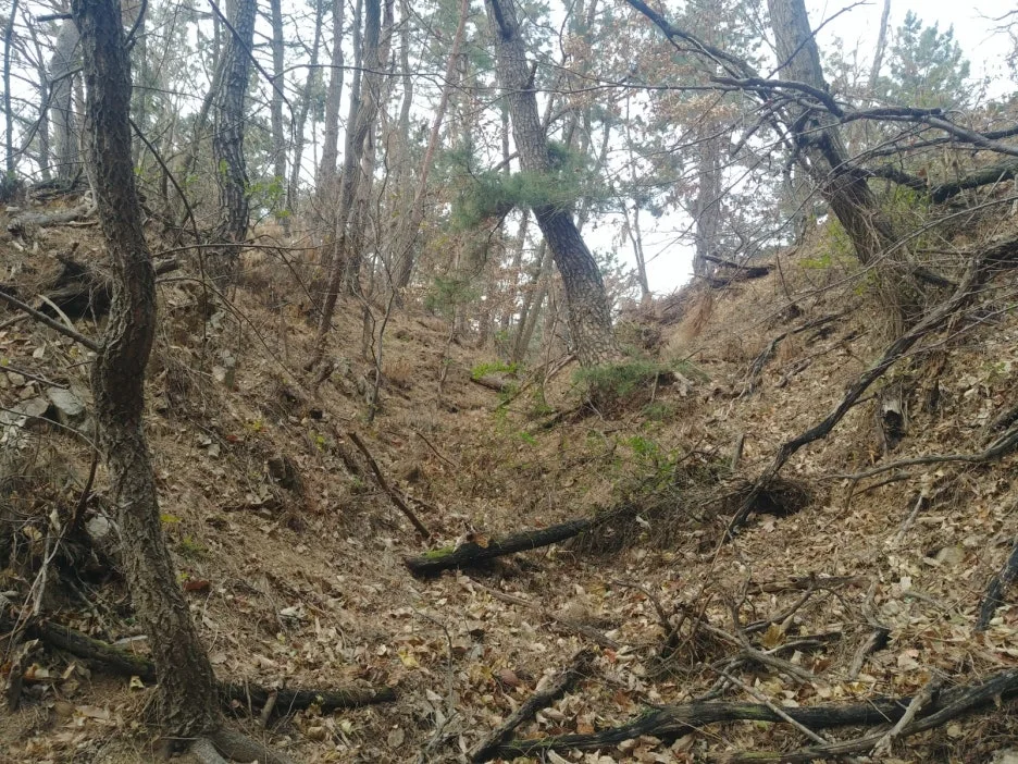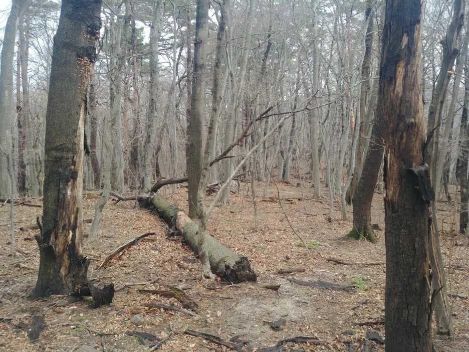 옛길 중간에 넓은 터가 나왔습니다. 그런데 나무들의 상태가 이상합니다. 불이 났던 흔적입니다.