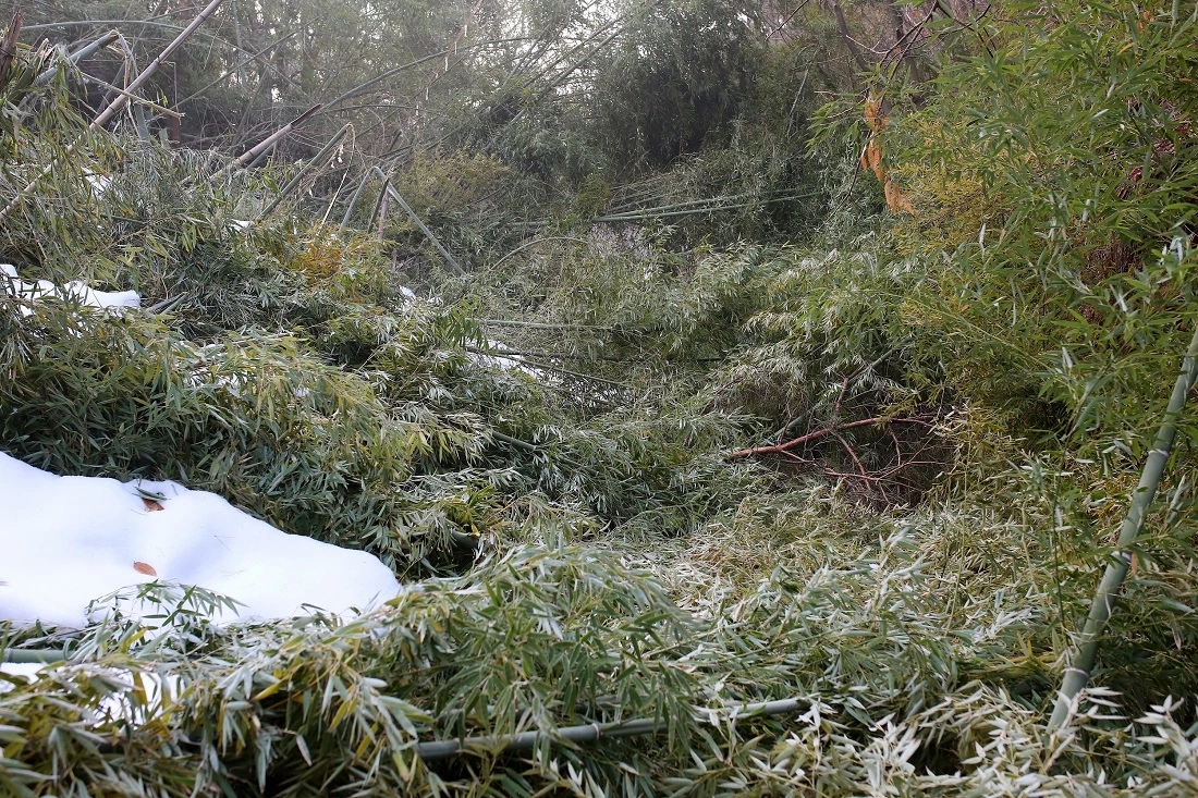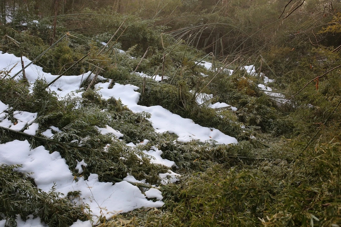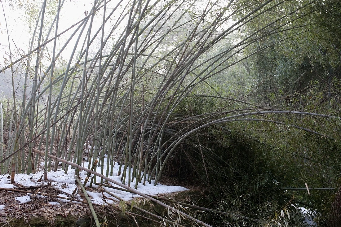 지옥의 대나무 덤불을 통과한 뒤 뒤를 돌아보았습니다. 대체 눈이 얼마나 내렸길래 10m쯤 되는 꼿꼿한 대나무가 이처럼 누웠을까요? 부러질지언정 휘지 않는 대나무의 기개를 찬양했던 옛 글이 참 무색합니다.