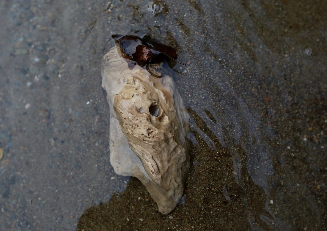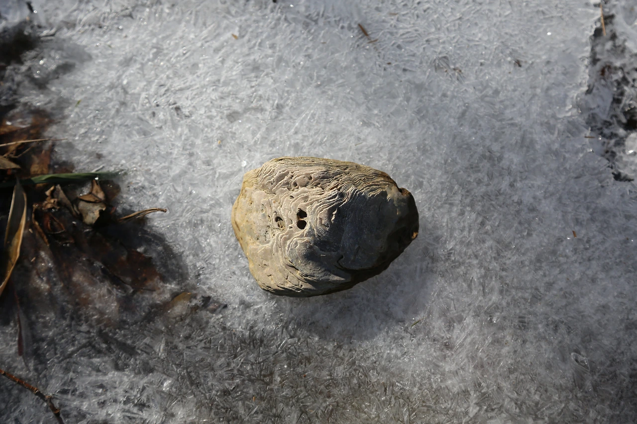 굴화석 가운데 동그란 구멍이 종종 보이는데 이는 돌이나 패각에 구멍을 뚫고 사는 갈매기 조개의 흔적입니다. 지난번 가리비 화석 편에서 소개했던 이매패이기도 하죠. 굴을 잡아먹기 위함이 아니라 자신의 은신처를 만들기 위해 구멍을 파고 살아가는 것이죠.