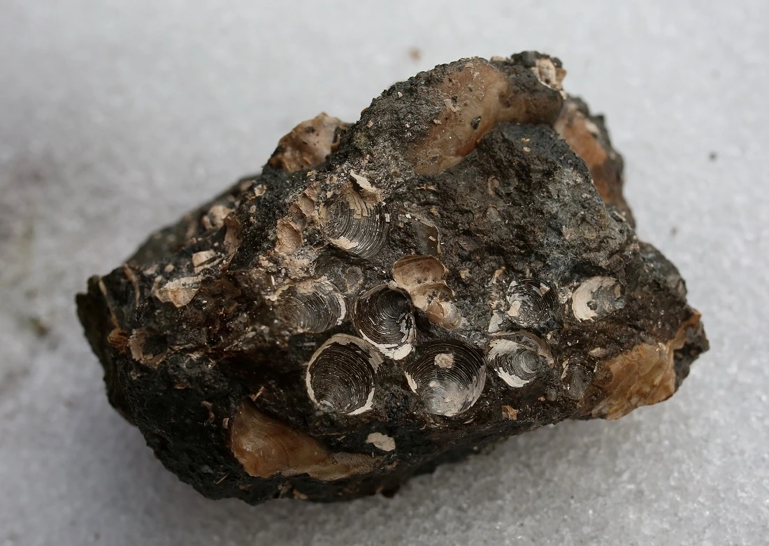 이 이매패에는 가운데 구멍이 뚫려있습니다. 이는 이매패에 구멍을 뚫어 체액을 쪽쪽 빨아먹는 포식자 복족류의 식흔입니다. 즉 이 이매패는 화석이 되기 전 이미 무지개다리는 건넜다는 뜻이기도 합니다. 이곳에서는 이와 같은 식흔 화석이 종종 발견됩니다.