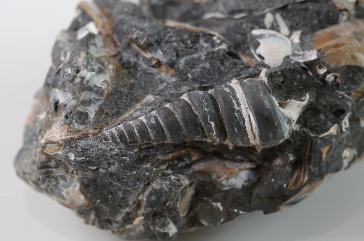 이 화석은 탄산칼슘으로 이루어진 외골격이 녹아버리고 내부 공간에 다른 물질이 남았습니다. 원래는 살아있을 때 살이 차 있었거나 죽고 난 후 빈 공간이었던 곳에 진흙 등이 들어가 이처럼 단단한 화석이 된 것이죠. 마치 용수철을 보는 듯합니다. '비카리아 속(Vicarya.sp)'으로 보입니다.