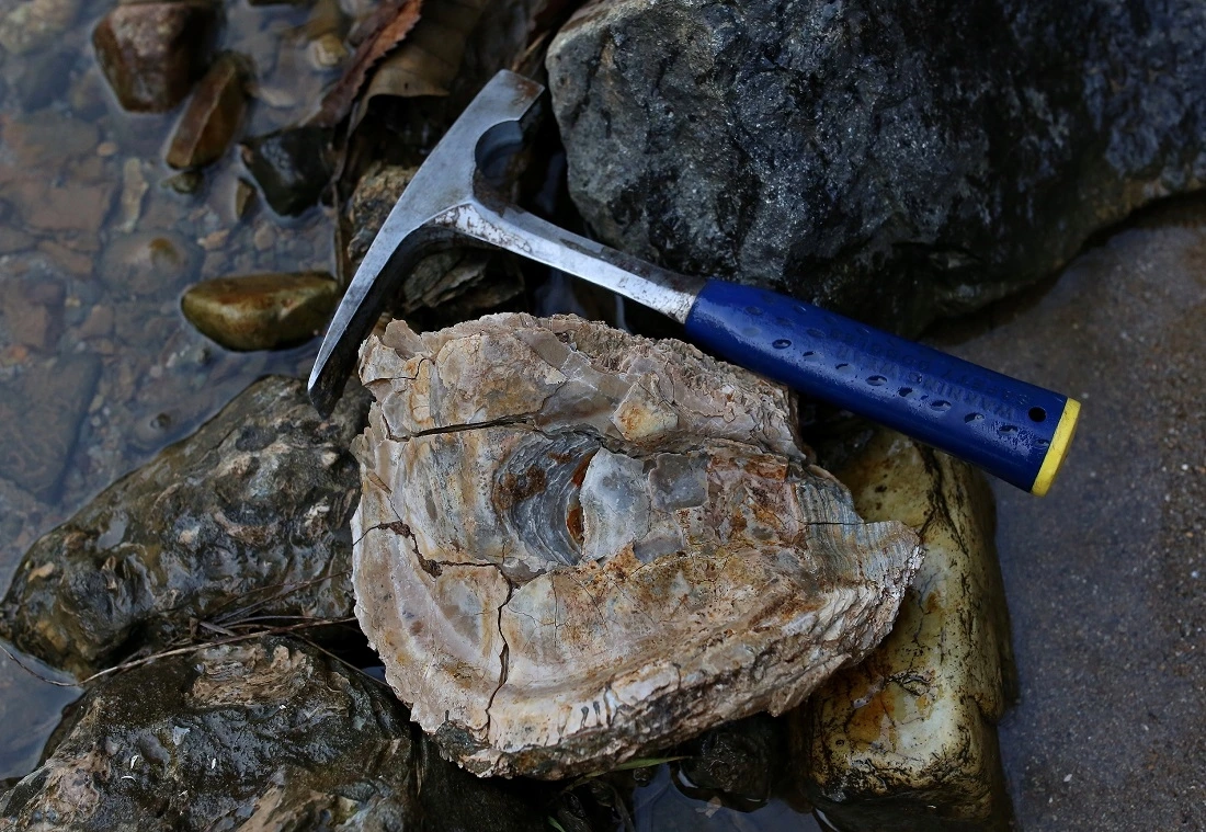 이 계곡을 따라 걸으면 가장 흔하게 보이는 것이 바로 굴화석입니다. 하지만 지난번 문무대왕면에서 보았던 길쭉한 형태의 굴 '크라소스트레아 그라비테스타 어일엔시스(Crassostrea gravitesta eoilensis)' 즉 길쭉이는 거의 찾아볼 수 없습니다. 대신 '크라소스트레아 그라비테스타 요코야마(Crassostrea gravitesta Yokoyama)' 즉 넙쭉이가 대부분이죠. 사실 먼저 소개해서 그렇지 길쭉이가 매우 귀한 화석이긴 합니다.