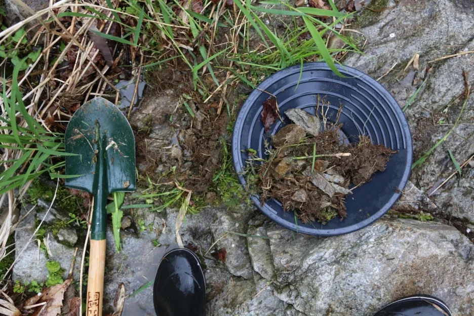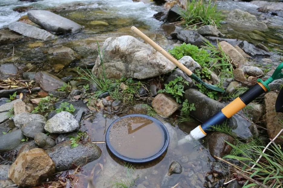 수동 석션기(흡입기)도 적극 활용해 모래와 흙을 퍼올려 패닝접시에 담아봅니다. 수동 석션기는 화장실 변기가 막혔을 때 쓰는 뚜러뻥과 같은 물건이라고 보면 됩니다. 사금이 들어있는 흙과 모래를 쭉쭉 빨아들이는 매우 유용한 도구죠.