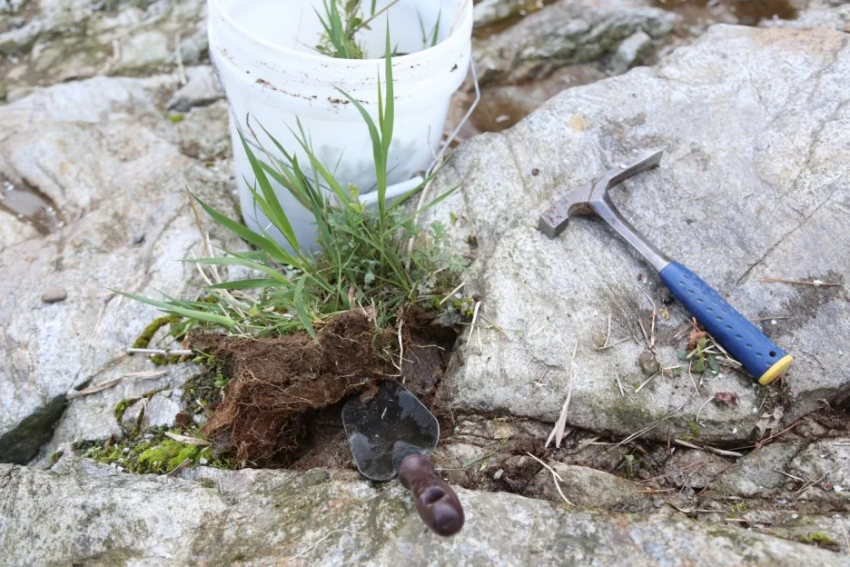 크랙에 자리 잡은 풀을 작은 꽃삽으로 캐서 버킷에 모아봅니다. 풀뿌리에 붙어있는 흙은 종종 사금을 붙잡고 있기 때문입니다.