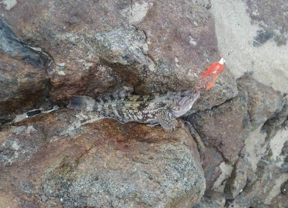 밑걸림이 없는 곳에서는 바닥에 가라앉는 타이라바를 사용해도 괜찮습니다. 감성돔 대신 타이라바를 물고 나온 손님 고기입니다. 4짜 쥐노래미네요. 쥐노래미도 회맛이 일품인 고급어종입니다.
