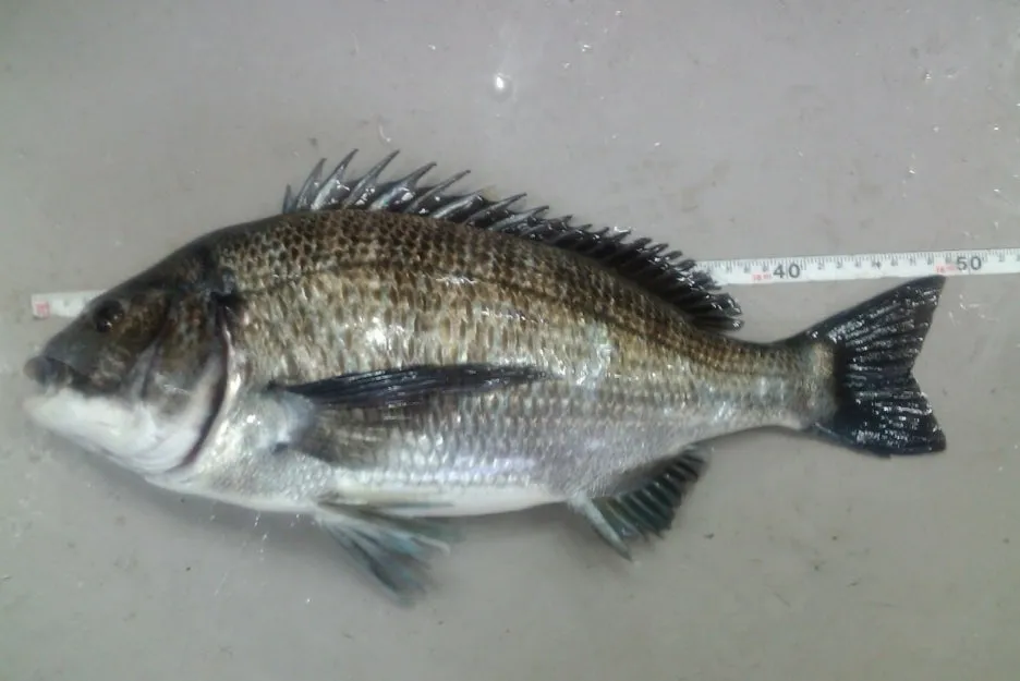 45cm 감성돔입니다. 횟집에 있는 시커먼스 같은 감성돔과 달리 낚시로 막 잡아낸 감성돔은 때깔이 아주 좋습니다. 지느러미도 깨끗하죠.