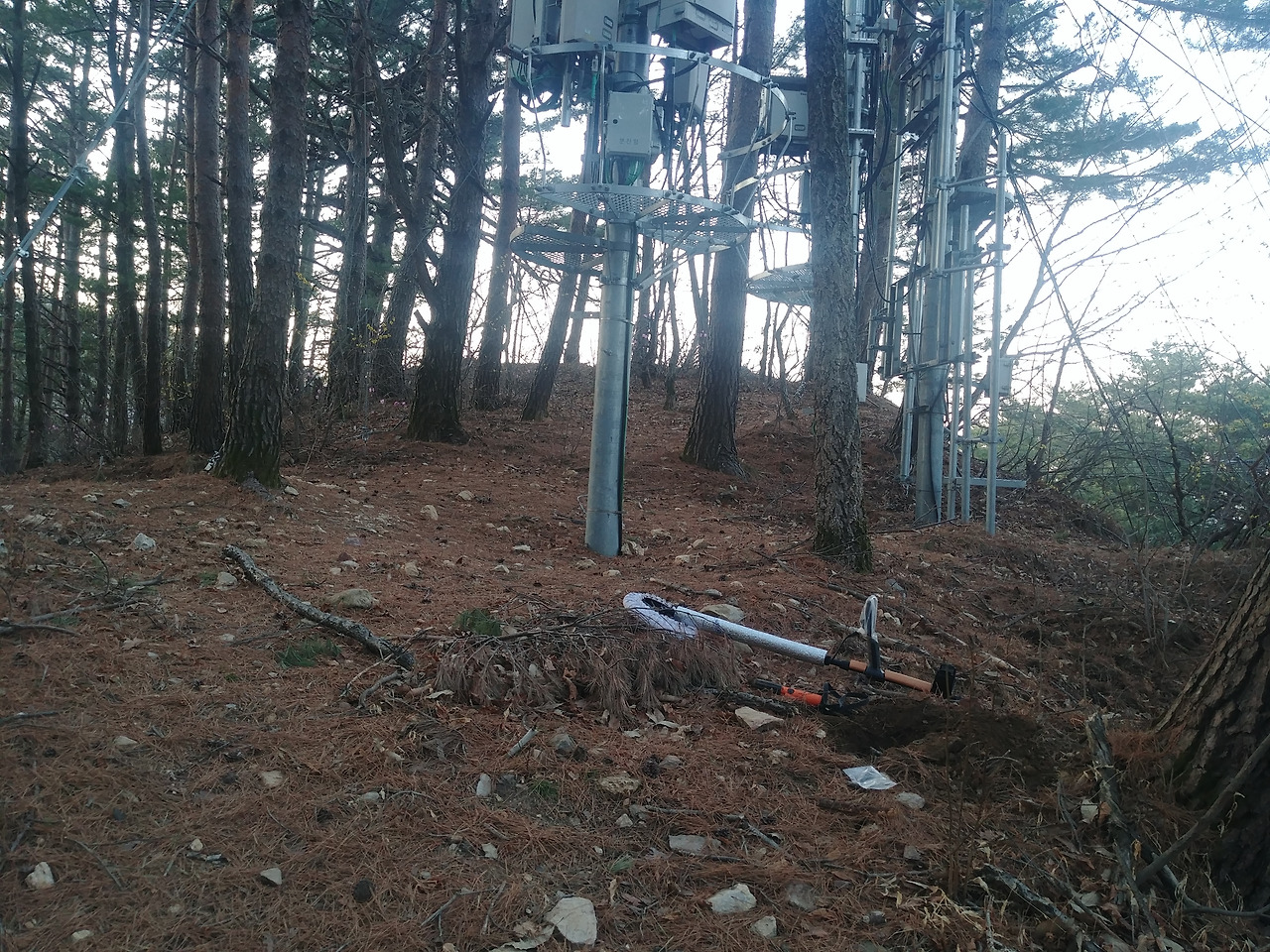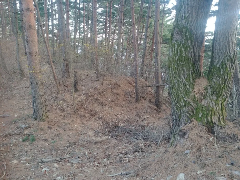깨진 도자기와 돌멩이가 흩어져 있는 것으로 보아 예전에는 번듯한 돌무더기가 있었던 것 같습니다. 하지만 통신 중계기를 세우면서 돌무더기를 밀어버리고 흙을 덮어 버린 것으로 추정되는 상황입니다. 하고 많은 자리 중에 하필이면 여기다 이런 걸 세우는지.
