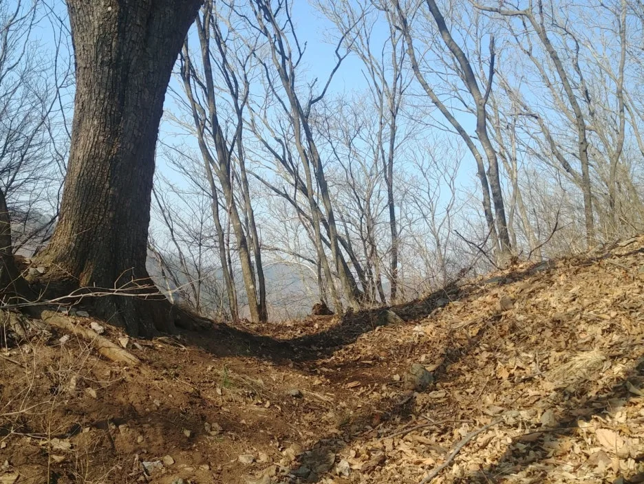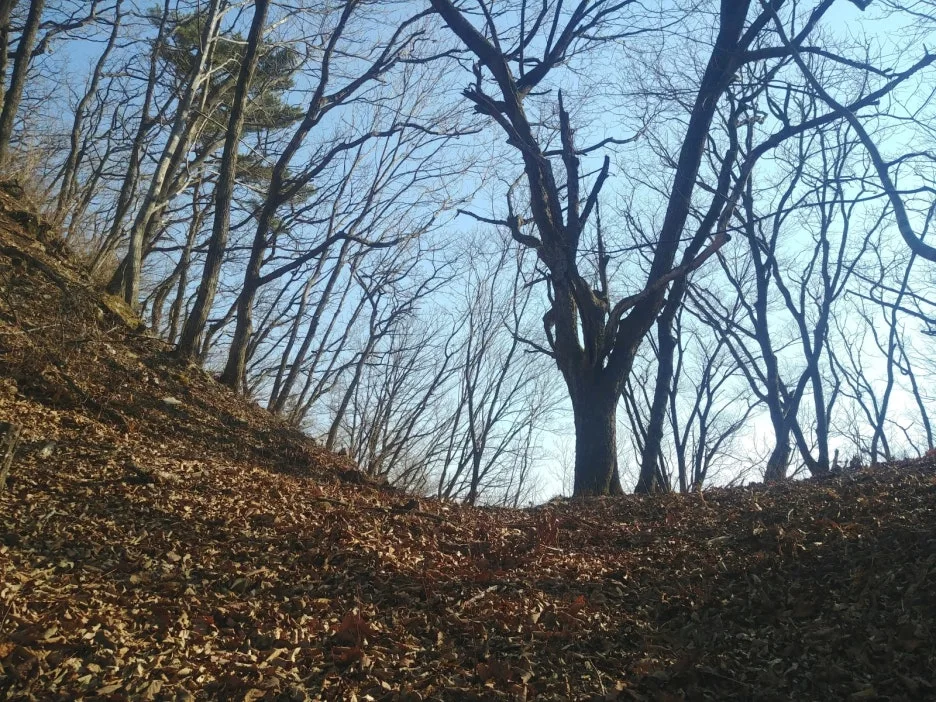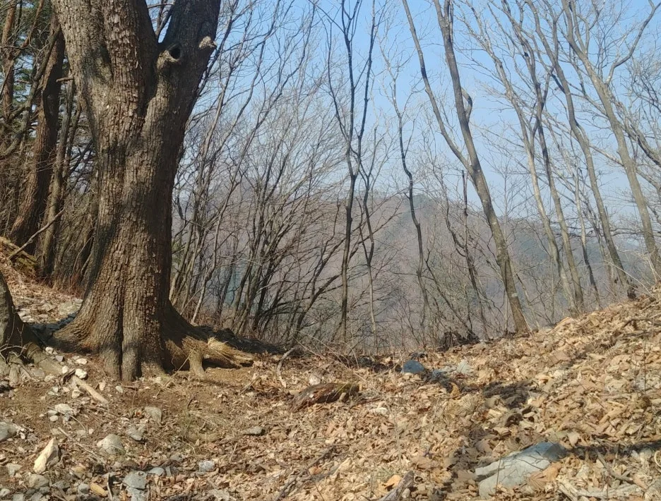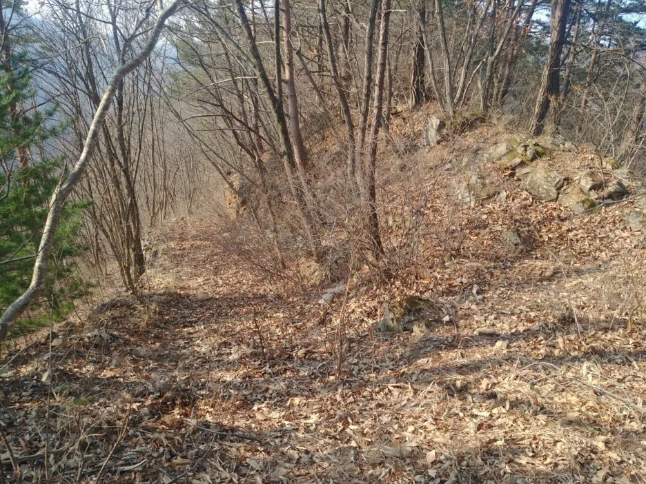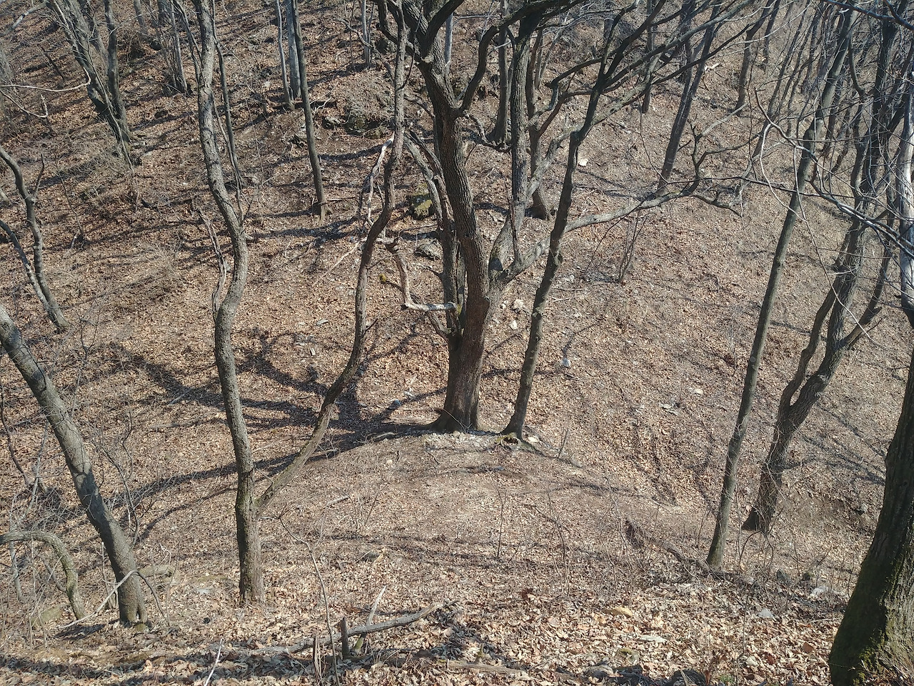 정상까지 올라가서 능선을 타고 한참을 돌고 돌아 애초에 목적했던 장소에 이르렀습니다. 앞에 있는 큰 나무 좌우로 옛길입니다.