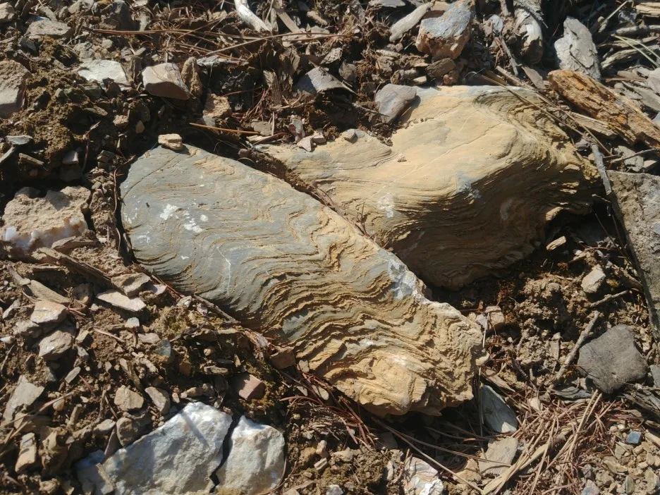 여기도 석회암이 눈에 많이 뜨입니다. 이 석회암을 가져다 잘게 부순 다음 염산이나 빙초산에 담가두면 '코노돈트'라는 미화석(微化石)을 얻을 수 있습니다. 모암인 석회암(CaCO3)이 산과 만나면 녹아버리고 산에 녹지 않는 이산화규소(SiO2)로 된 화석만 남게 되는 것이죠.