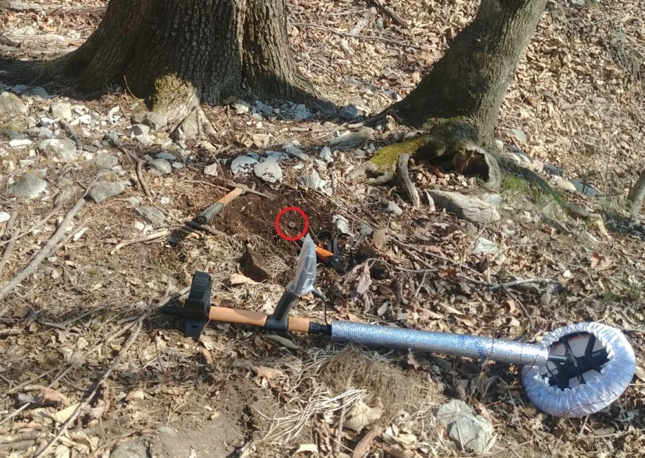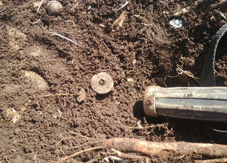 앉아서 쉬기 좋아 보이는 평평한 곳에 탐지기를 대보자 바로 엽전이 나옵니다.