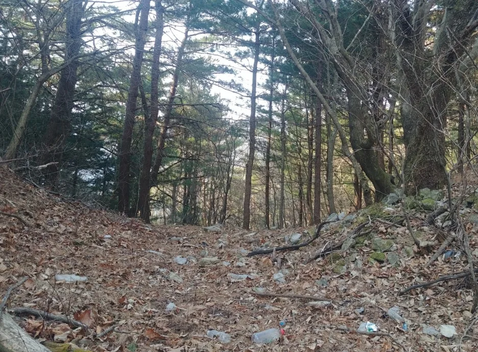 고개에 이르니 오른쪽 나무에 돌이 조금 쌓여있는 게 보입니다. 전에 말했던 엽전 노다지죠. 그런데 주변이 온통 쓰레기 천지입니다. 대부분 요즘 것은 아니고 꽤 오래전에 버려진 것들이었습니다. 보통 금속탐지를 하면서 발견하는 쓰레기는 비닐봉지에 담아 모았다가 버리는데 이번은 도저히 감당이 안됩니다. 페트병 등 부피가 큰 쓰레기가 많아도 너무 많네요.