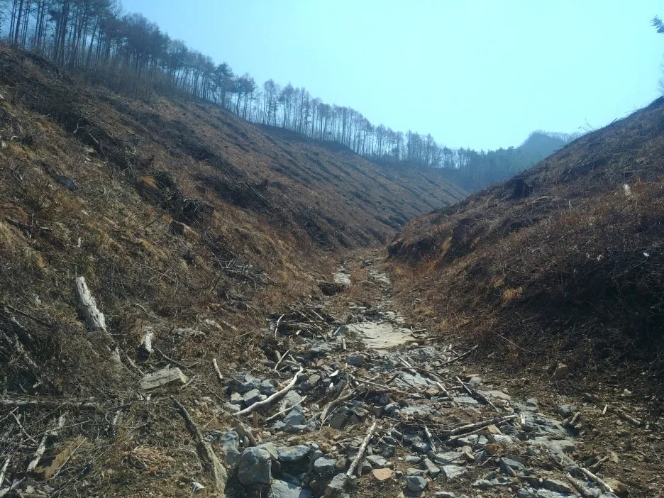 그런데 고개에서 내려가는 길에 큰 난관에 봉착했습니다. 대체 얼마나 오랫동안 고갯길로 사람이 다니지 않았길래 길이 이 모양이 되었을까요?