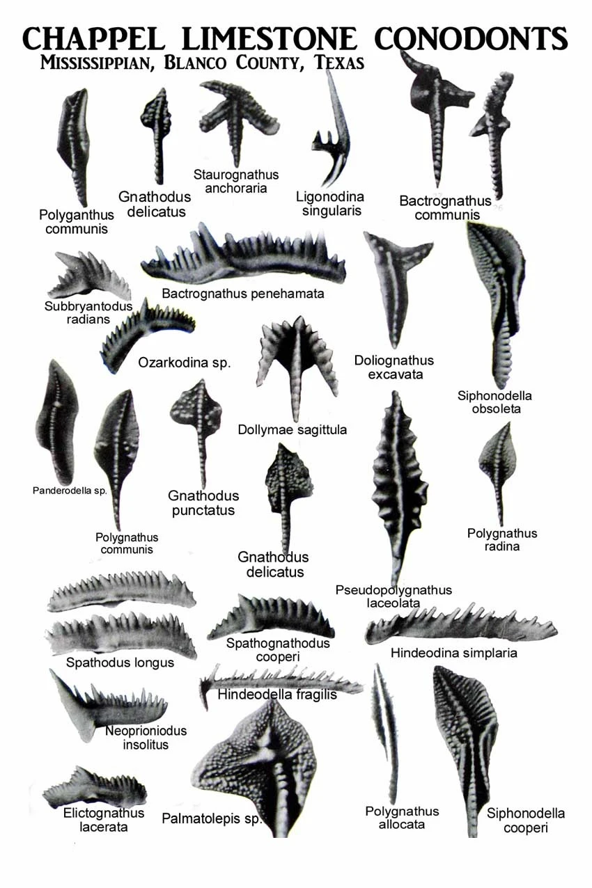 논문에 나온 다양한 코노돈트 화석의 모습입니다. 직접 찾고 싶으신 분은 석회암을 깨서 한 번 실험해 보시길 권합니다. (주의 : 시판되는 시멘트는 석회암이 주성분이지만 곱게 갈았기 때문에 안됩니다.)
