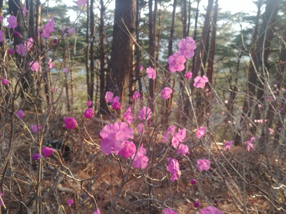늦은 오후, 노을빛으로 화장해 더욱 예뻐진 진달래가 온 산에 가득합니다. 정말 봄이네요.