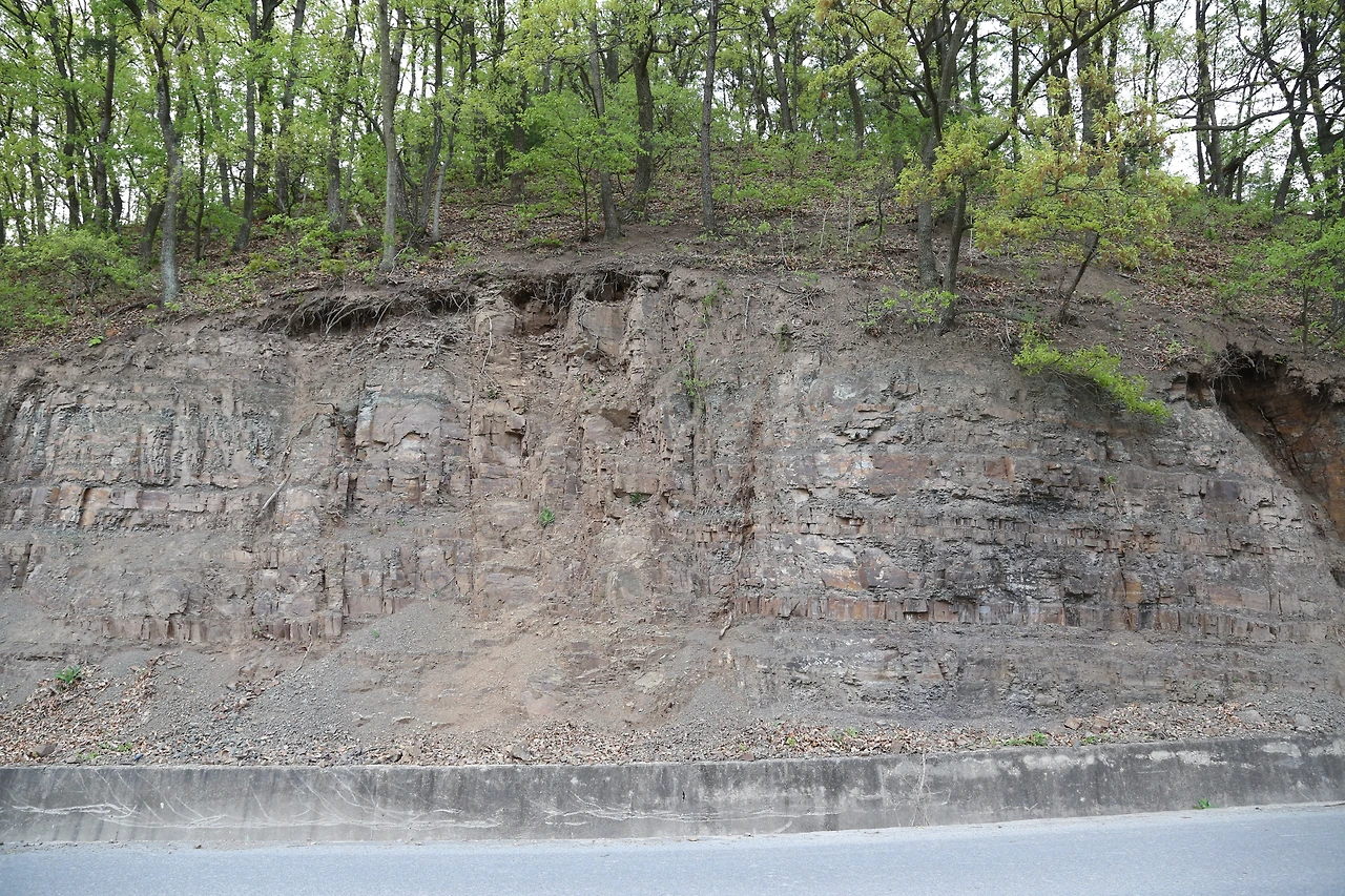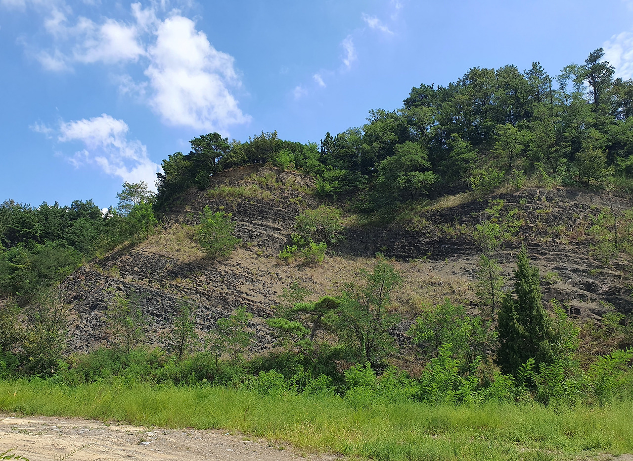 약 1억 년 전 중생대 백악기에 형성된 건천리층이 잘 드러나 있는 노두 즉 지층의 모습입니다. 중생대의 대표적인 동물로는 공룡과 암모나이트가 유명한데, 우리나라에서 공룡 화석은 여러 차례 발견되었지만 암모나이트는 단 한 번도 발견되지 않았습니다.