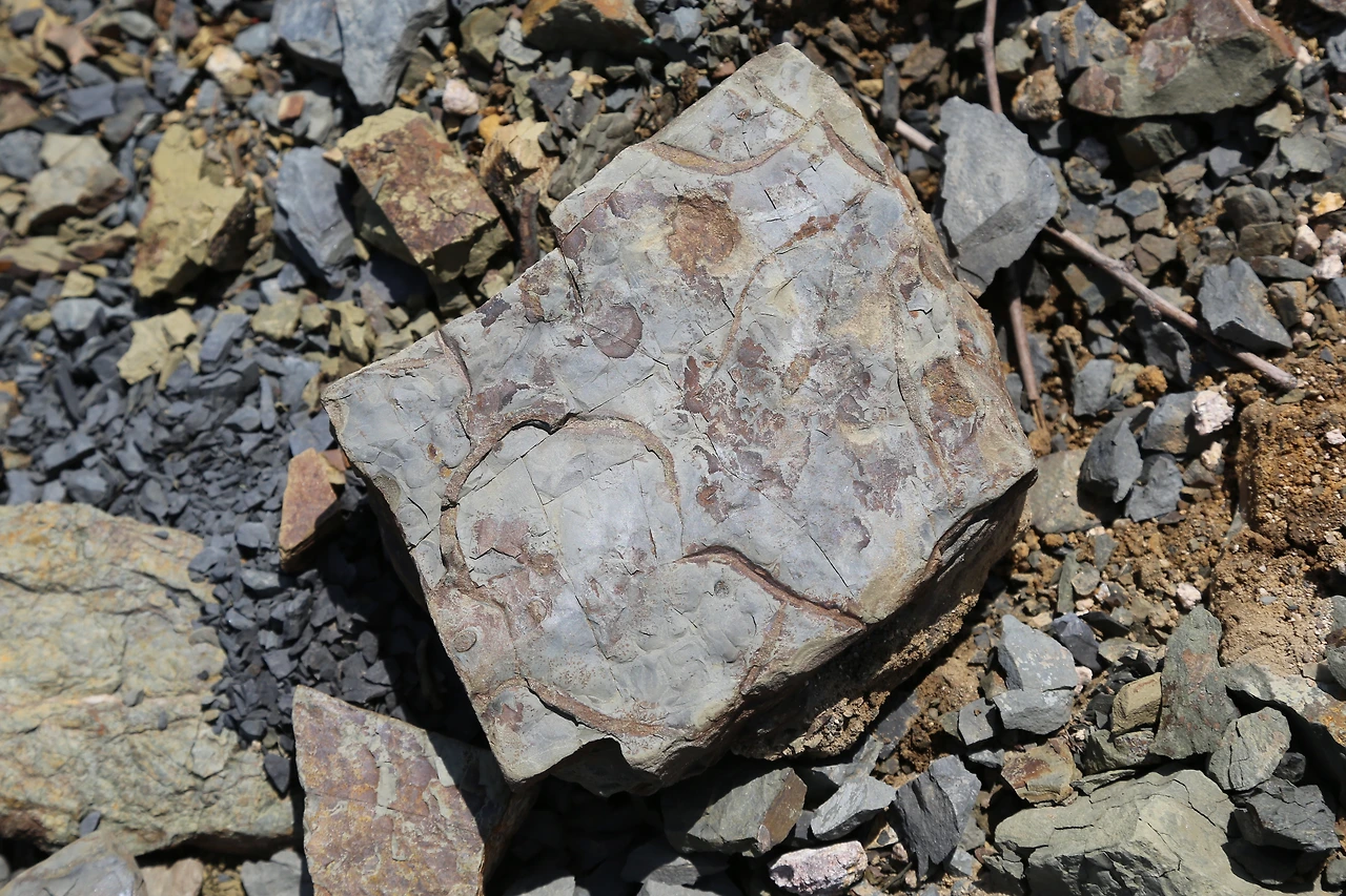 폐석 더미 사이에 이매패의 단면이 드러난 화석이 보입니다. 잘 모르면 화석인지도 모르고 지나칠 만큼 성의 없게(?) 생긴 화석이네요.