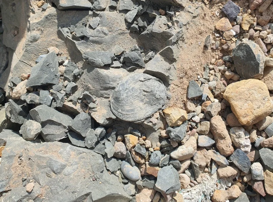 생뚱맞게도 폐석 더미에 이질적인 유백색 이암이 더러 보입니다. 바로 포항에서 흔히 볼 수 있는 떡돌이죠. 이게 어쩌다 여기에 와서 버려졌는지 알쏭달쏭합니다. 만만한 돌을 하나 두드려보니 이매패 화석이 모습을 드러냅니다. 중생대 지층이 있는 곳에서 신생대 화석이 튀어나오다니, 시공을 초월한 만남이네요.