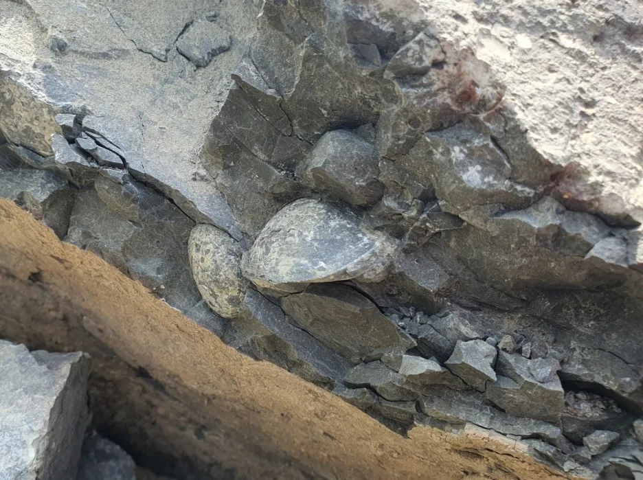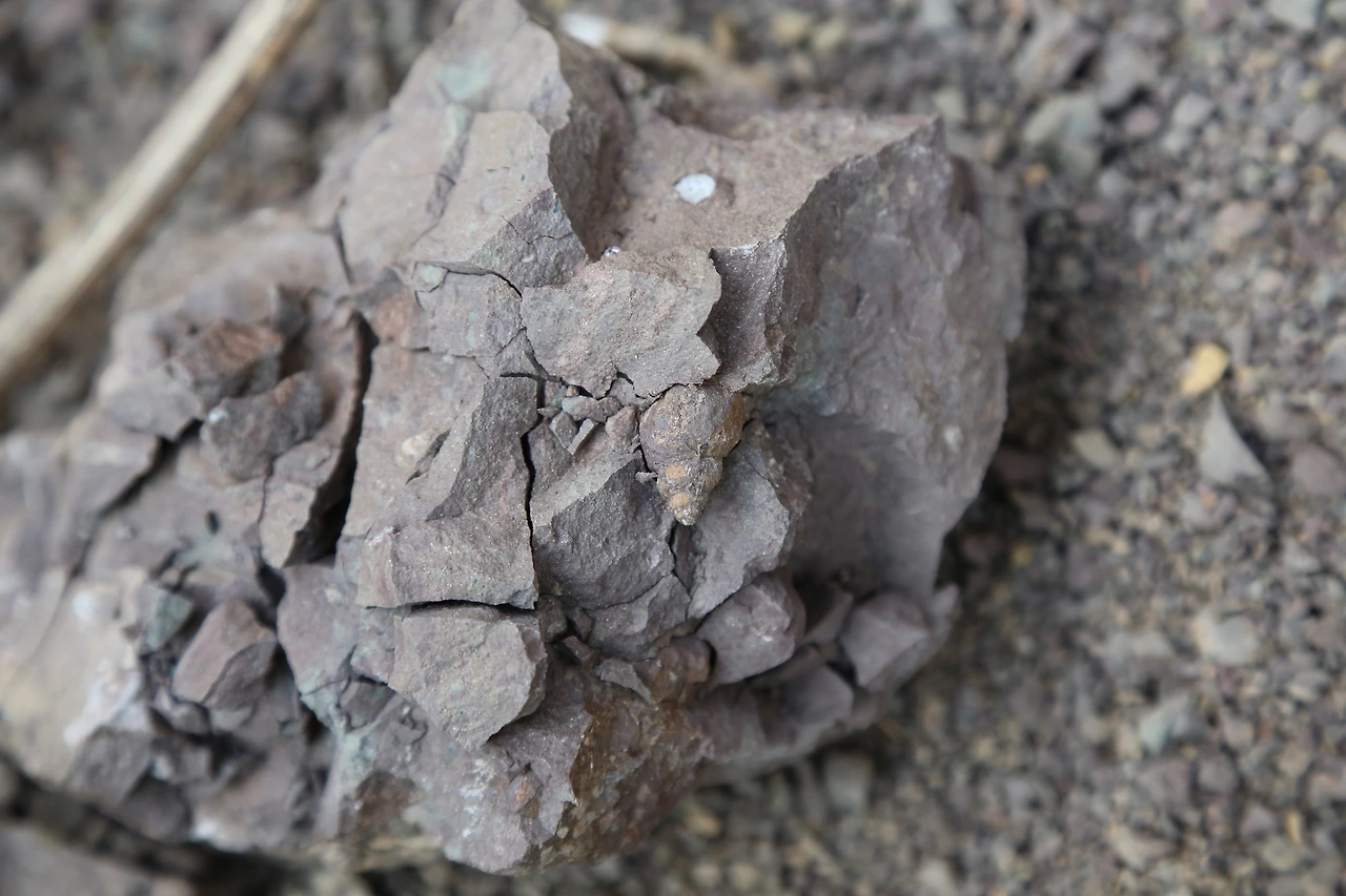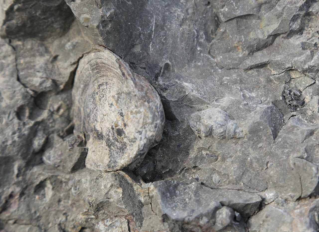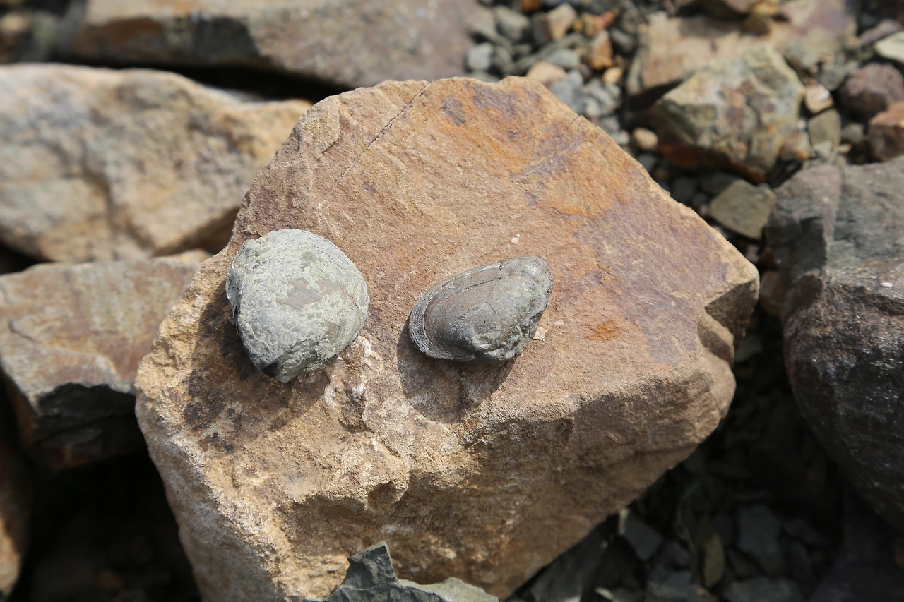 약간 회색빛을 띠고 있는 건천리층 암석입니다. 망치로 몇 번 두드리니 이매패 화석들이 모습을 드러냅니다.