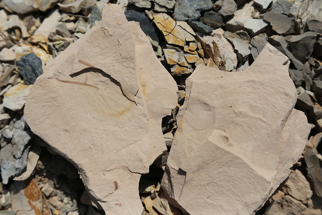 이것들은 중생대에 번성했던 이매패인 유삼각 조개 '트리고니오이데스 파우시술카투스(Trigonioides paucisulcatus)'입니다. 모암이 입자가 곱고 무른 실트암이라 살살 두드리면 부서지며 상대적으로 단단하게 경화된 화석들이 툭하고 떨어져 나옵니다.