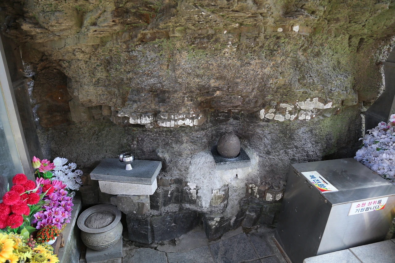 가운데 있는 알 같은 것이 바로 돌할매입니다. 이 동그란 돌할매는 언제인지는 정확하지 않지만 몇백 년 전부터 이 마을에서 영험한 수호신 역할을 했다고 하네요.