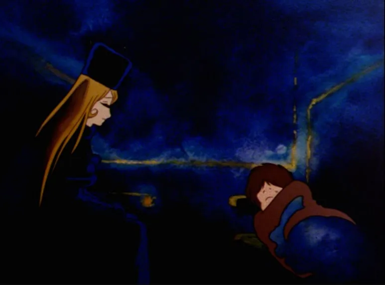 잠든 철이(테츠로)를 지켜보는 메텔의 얼굴이 우울해 보인다.