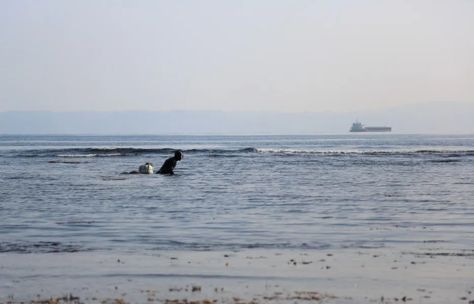 물질하는 해녀와 포스코로 들어가는 거대한 화물선이 한 프레임 안에 담긴 풍경이다. 목적을 가지고 같은 방향으로 나아가는 모습을 보는 것 같아 묘한 공통점이 느껴졌다.