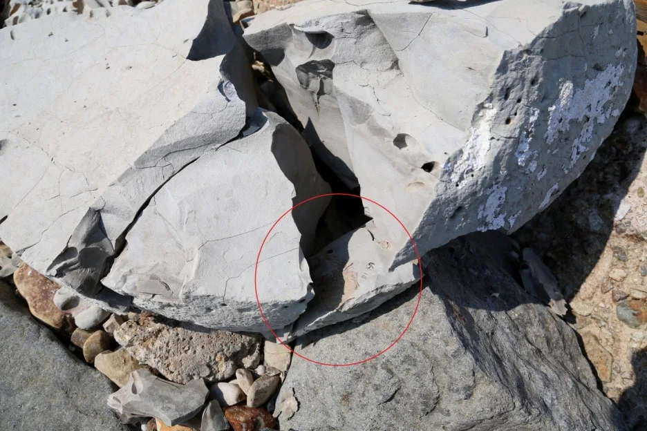 바위에 구멍을 파는 갈매기 조개도 요행히 화석을 비켜서 집을 지었다. 꼬리 쪽이 떨어져 나간 게 조금 아쉽지만, 전체적으로는 흠 잡을 것이 없는 멋진 화석이다.
