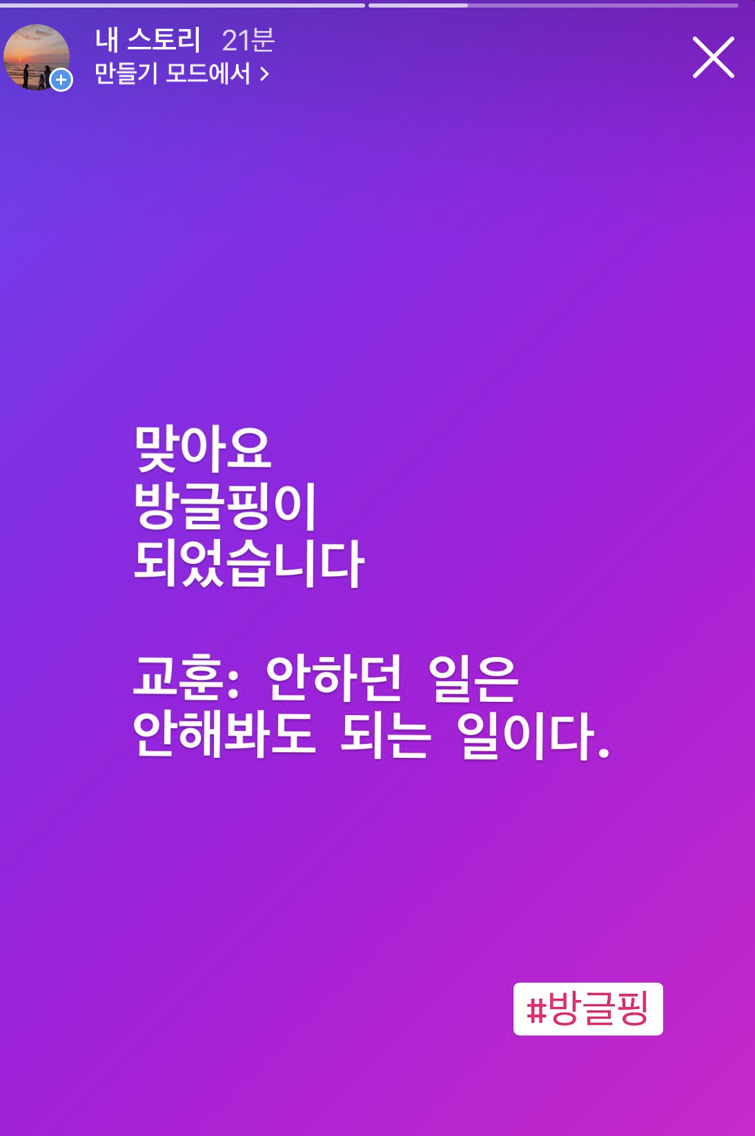 우연히 글쓰기 첫 모임에 나갔는데, 집에 돌아와 나를 소개하며 “보라색 머리입니다.”라고 어필했다. 모두 ‘아, 보라색 머리 기억나요.’라고 답했다. ‘튀어 보이긴 싫지만... (알고 보면 즐기나?) 나를 나타내고 남이 기억하기에 좋네. 역시, 보라색 머리로 하길 잘했다.’ 싶었다. 생애 처음 해 본 일이 나를 나타낼 수 있는 장치가 되었다. 앞으로도 한 번도 해보지 못한 일을 하면서 나를 찾아가고 싶은 설렘까지 느꼈다.