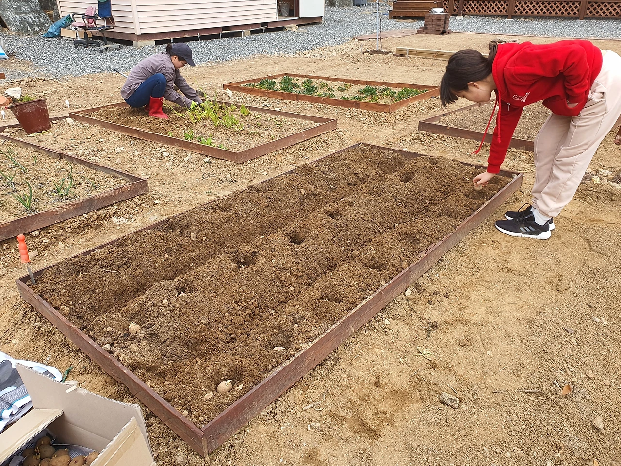 아내가 감자 심기를 명했다. 그래서 이랑을 파고 두둑을 쌓고 15~20센티미터의 간격으로 감자를 심을 구멍을 팠다. 딸내미는 내가 파 놓은 구멍에 감자를 한 알씩 넣었다.