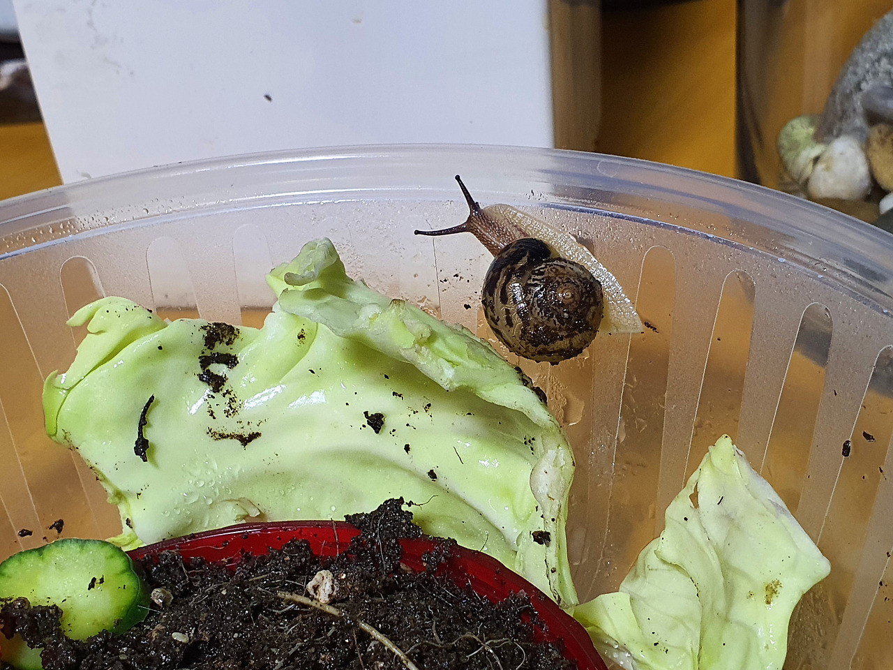 그렇게 거의 3주가 넘게 달팽이를 돌봐주고 있다. 이제 처음 데려왔을 때보다 1.5배는 커졌고, 먹성도 더 좋아졌다. 그렇다 보니 대변도 꽤 많이 싸고 있는데...