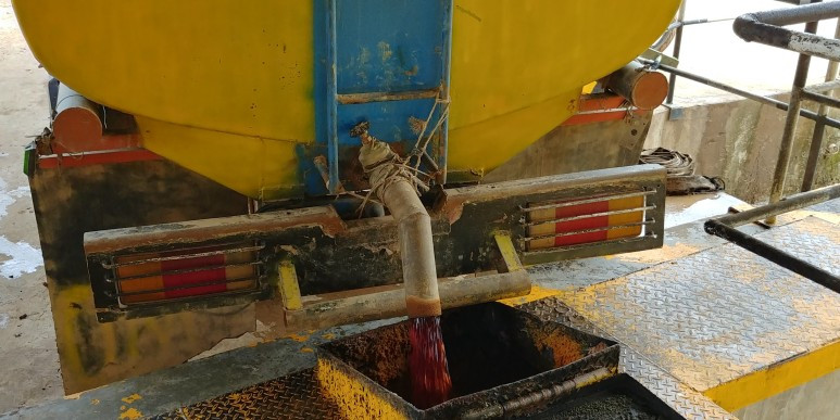운송 트럭에서 저장탱크로 옮겨지는 팜원유(CPO) (본인 촬영)