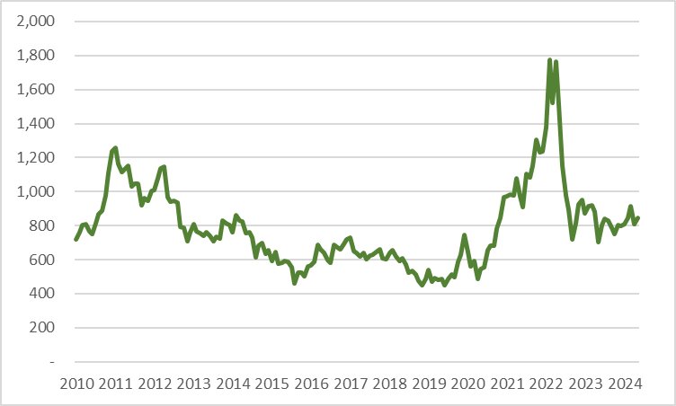 팜원유(CPO) 가격 (말레이시아 선물 기준, 단위: U$/톤, 출처: Investing.com)