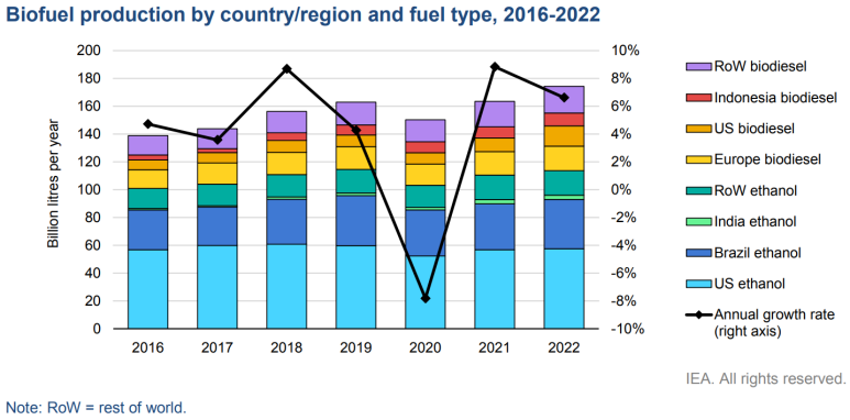 국가별 바이오 연료 생산량, 빨간색이 인도네시아 (출처: IEA, 국제 에너지 기구)