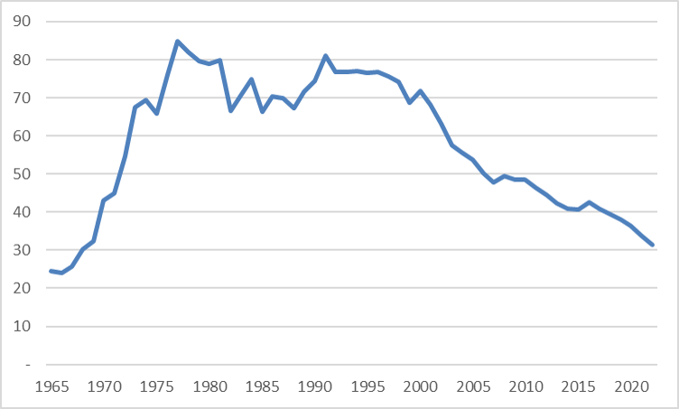 인도네시아 원유(Crude Oil) 생산량 (단위: 백만 톤, 출처: Energy Institute)