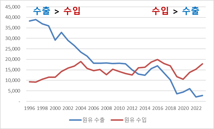 그래프에서 빨간색이 원유(Crude Oil) 수입량, 파란색이 수출량인데요. 순수출국에서 순수입국이 되고 있는 모습이 아주 명확하게 보입니다.