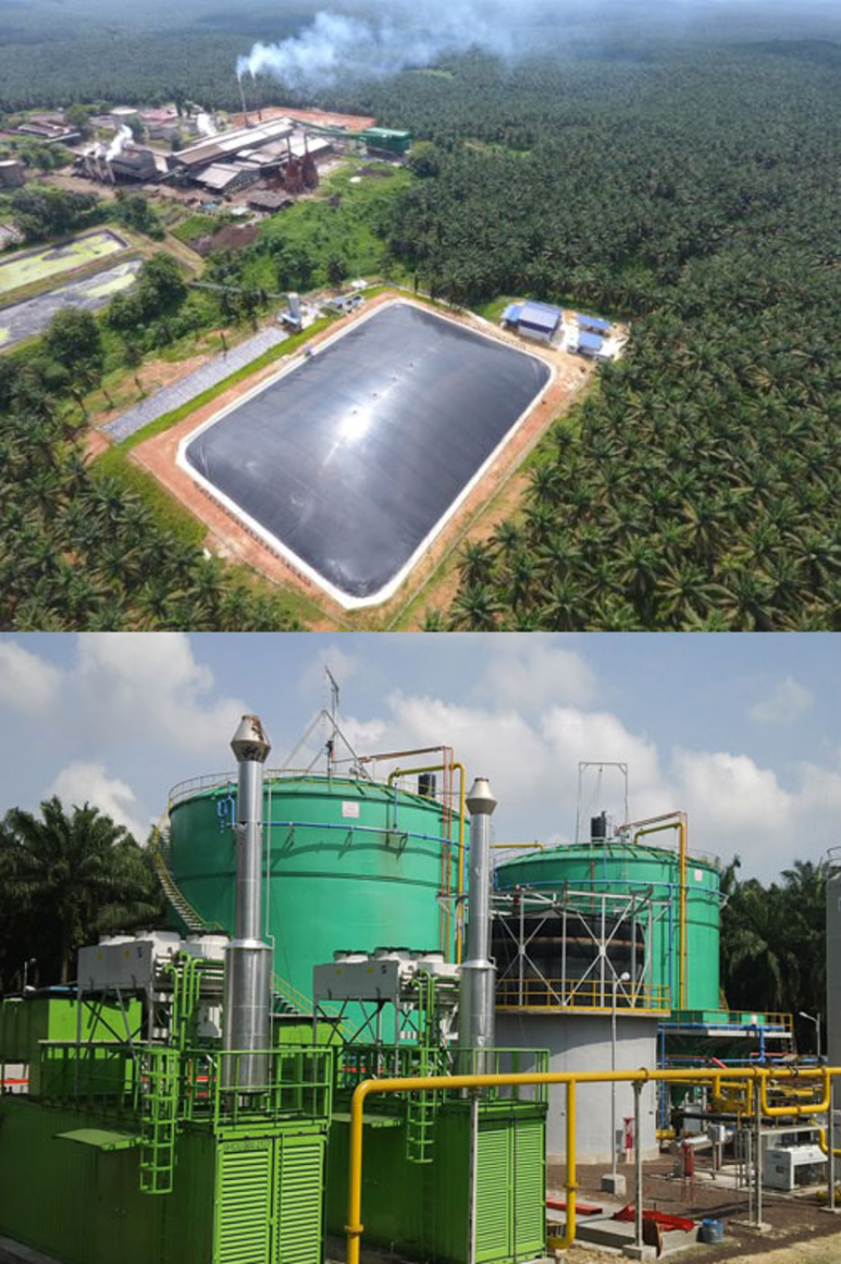바이오가스 발전소(Biogas Plant)는 팜유 폐수 처리 시설 중 메탄(CH4)이 발생하는 부분(혐기성 분해 시설)에 설치해서, 메탄을 포집하여 전기를 만들어내게 됩니다. 전기만 만드는 게 아니라, 메탄의 배출을 막아 지구 온난화를 막는 역할도 하니, 일석이조의 효과입니다.