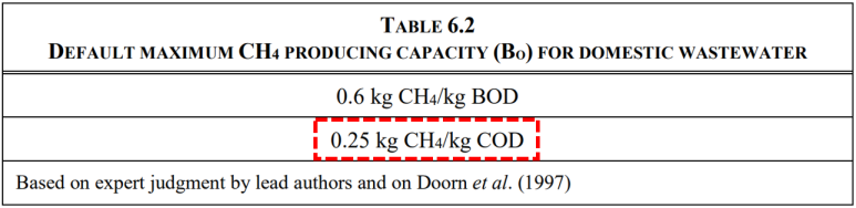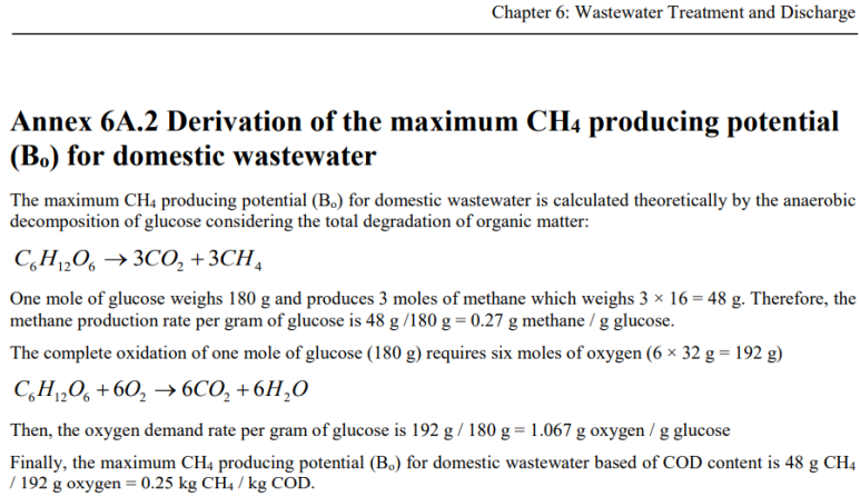 48 나누기 192 하면 0.25가 되니, 같은 말로 ‘COD 1g/m3인 폐수 1m3에서 나오는 메탄은 0.25g’이라는 뜻이 되겠습니다. 이것을 UNFCCC에서는 단위만 kg으로 바꿔서 이렇게 표현합니다.