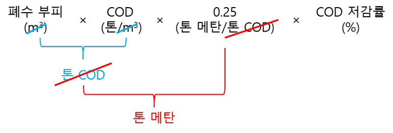 괄호 안에 단위를 표시해 두었는데, 아래와 같이 단위를 소거하면, 결국 폐수에서 나오는 메탄 배출량이 총 몇 톤인지 구할 수 있습니다.