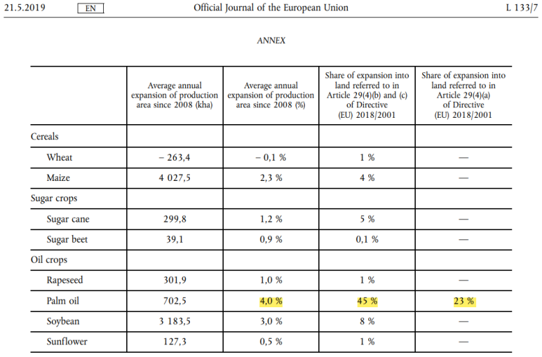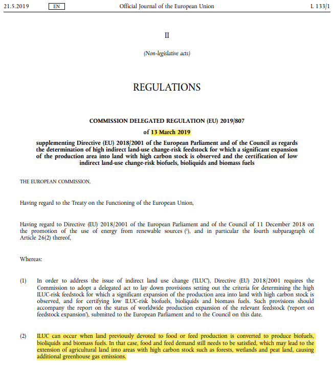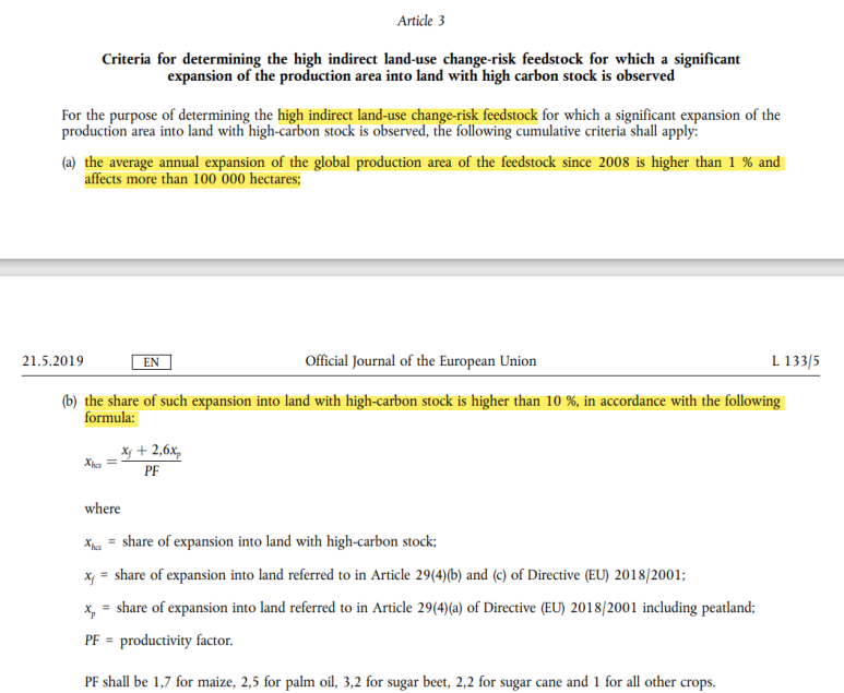 EU의 속마음이야 어쨌든, 팜유를 전체 퇴출이 아닌 굳이 '바이오디젤 연료서' 퇴출하는 근거로 드는 것이 ILUC(Indirect Land Use Change) 개념입니다. 즉, 바이오디젤용 팜유 만들기 위해서는 식용 외에도 더 많은 팜유를 생산해야 할 것이고, 그 과정에서 더 많은 팜농장을 개간해야 하는데, 이 개간(Land Use Change)이 오히려 환경을 더 파괴한다는 논리입니다. ILUC-risk가 높은 작물을 규정하는 나름의 수식도 있는데, 사실 수식으로 써져 있더라도, 수학/과학보다는 국가 간의 이해관계와 논리의 싸움인 것 같습니다. 어쨌든, EU의 수식과 기준으로 보면 팜유가 ILUC-risk가 높은 작물로 규정되었고, 팜유를 점차적으로 퇴출해야 한다는 논리가 성립되었습니다.