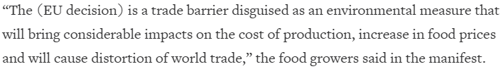 그간 EU는 '팜유'에 대해 집중 공격(?)을 해온 경향이 있었는데, 이번 EUDR 조치에는 대두, 목재 등도 포함돼 있다 보니 다른 나라들의 목소리도 들을 수 있습니다. 대두의 생산국인 남미에서는 EUDR을 '환경 보호를 빙자한 보호 무역주의'라며 강하게 비판하였습니다. 그리고 EUDR 이행을 위한 실사 선언서를 만드느라 오르게 될 생산 비용은 식량 물가 상승으로 이어질 것이라고도 하는데, 이 또한 일리가 있는 이야기입니다.