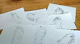 처음엔 그림을 그리기 시작했다. 텔레비전 잘 보고 있는 남편을 모델로 그리다가, 점점 낮에도 그리고 싶어 졌다. 그런데 마땅히 모델이 없어 내 손을 그렸다. 그러다 요즘은 발이다. 평소 아무 관심도 주지 않던 내 발, 손에 밀려 평생 빛을 못 보던 발에 대해 새삼 관심을 기울이기 시작했다.