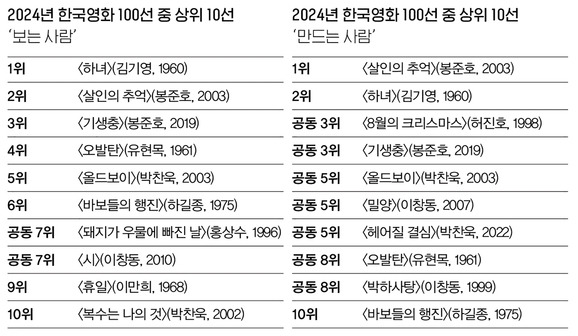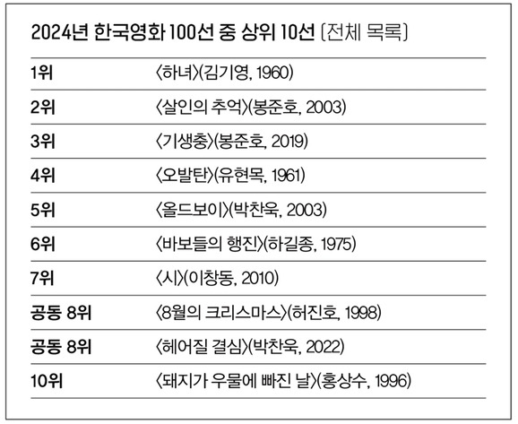 이번 선정에서 가장 주목할 만한 점은 김기영 감독의 <하녀>(1960)가 1위를 차지했다는 것입니다. 60년이 넘는 세월이 지났음에도 불구하고 여전히 그 예술성과 시대성을 인정받고 있다는 점에서, <하녀>는 한국영화의 고전으로서의 위상을 다시 한번 확인시켜 주었습니다. 그 뒤를 이어 봉준호 감독의 <살인의 추억>(2003)과 <기생충>(2019)이 각각 2위와 3위를 차지했습니다. 이는 한국영화가 세계적으로 인정받기 시작한 21세기 이후의 작품들이 이미 현대 한국영화사의 중요한 한 축으로 자리 잡았음을 보여줍니다.