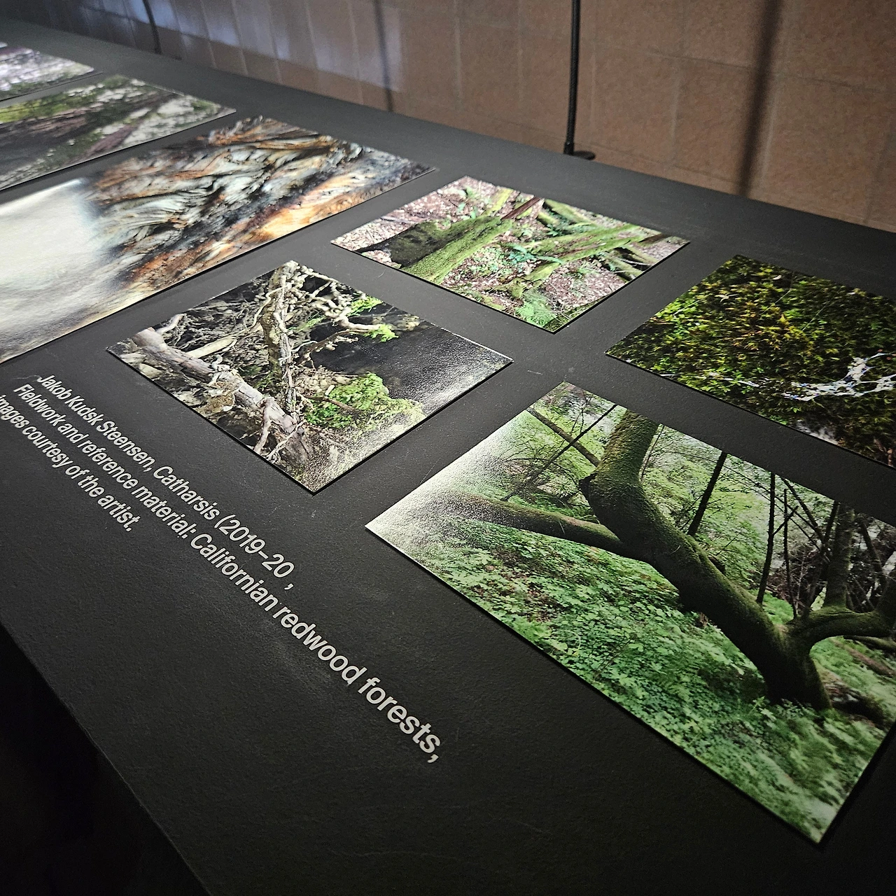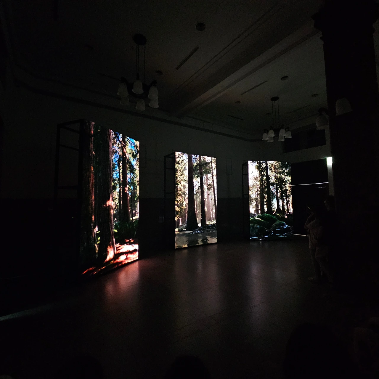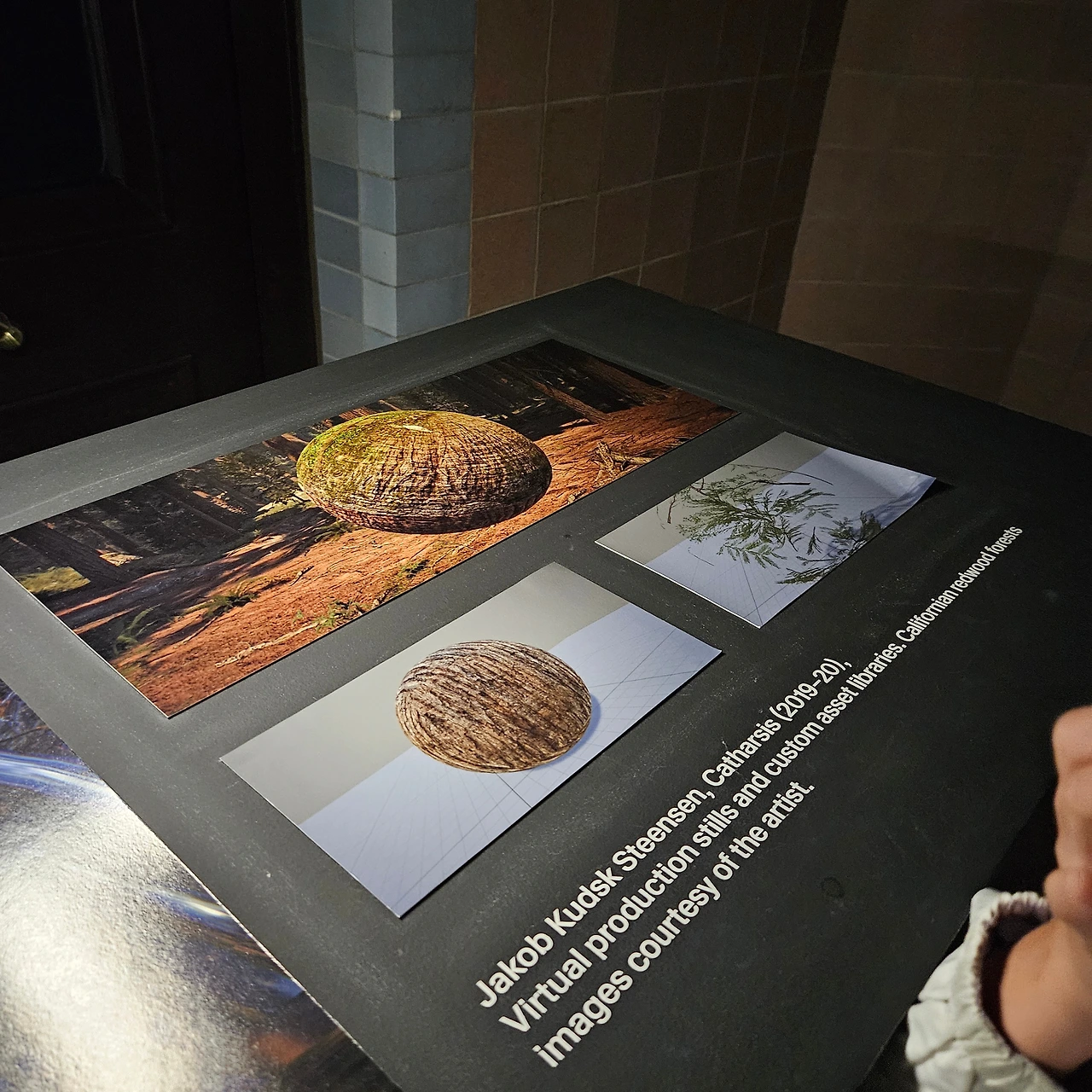 덴마크 출신의 Jakob Kudsk Steensen이 선보이는 "CATHARSIS"는 세 개의 큰 LCD 기둥을 통해 숲의 모습을 보여줍니다. 마치 살아 있는 듯한 CG로 구현된 숲의 모습은 천천히 움직이며 관람객의 시선을 따라가는 듯한 느낌을 줍니다. 작품 뒤에 전시된 레퍼런스 사진과 모델링 자료들은 작품의 제작 과정을 엿볼 수 있게 해 줍니다.